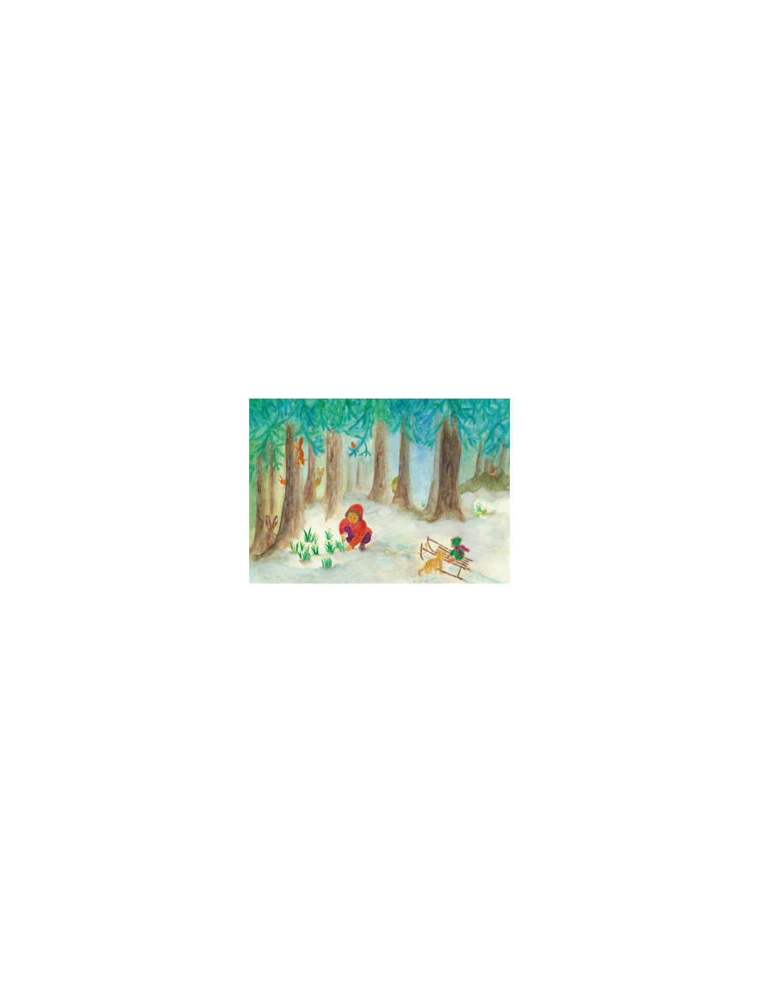 Hoewel er nog een dikke laag sneeuw ligt kun je zien dat de lente in aantocht is door de sneeuwklokjes die boven de sneeuw uit piepen. Het kindje dat met haar slee onderweg was kan het niet laten er stiekem een paar te plukken. Deze ansichtkaart is een feestje om neer te zetten op de lente seizoenstafel of om te verzenden.