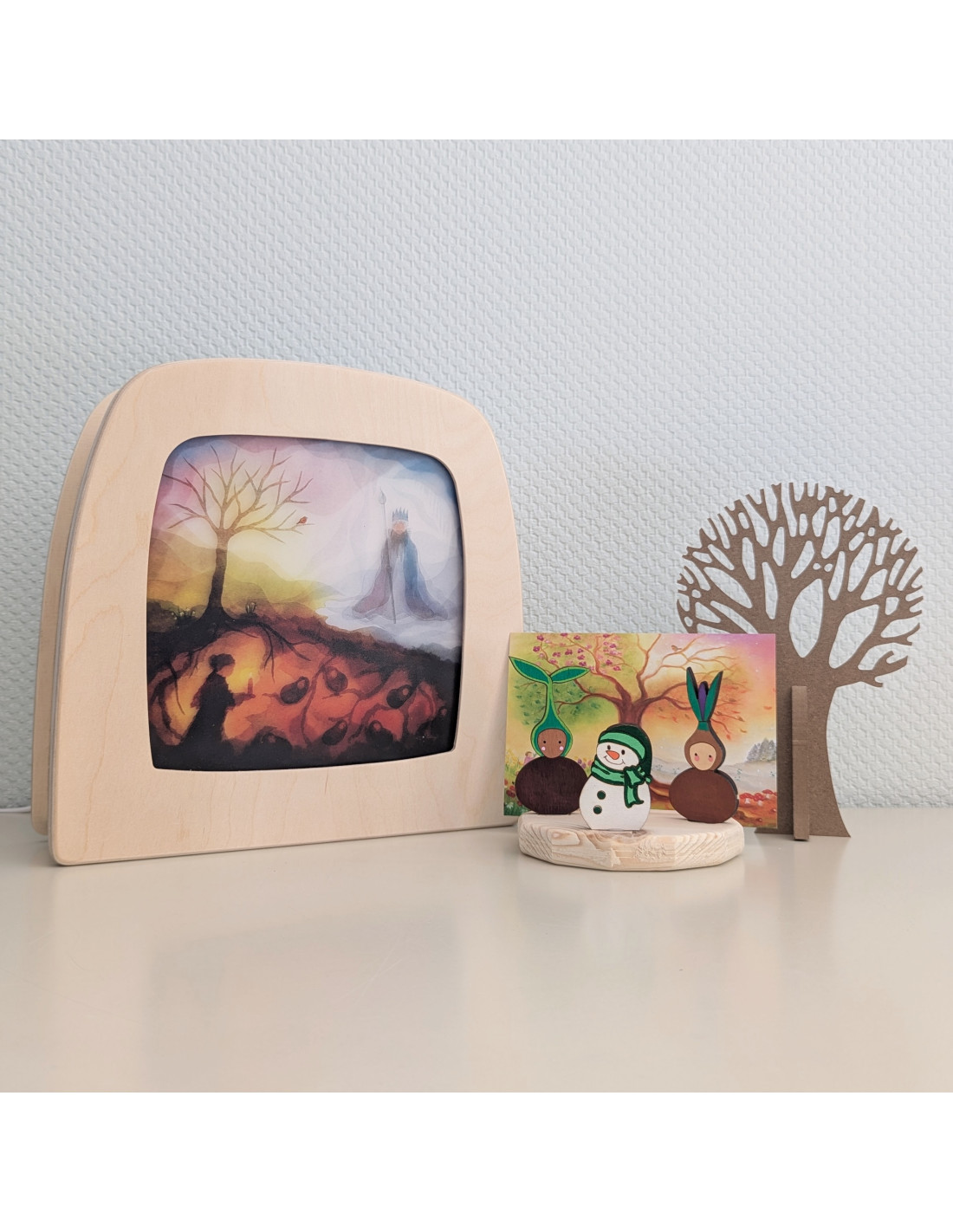 Deze prachtige ansichtkaart beeldt met één boom alle vier de seizoenen uit. Elke keer als je naar de kaart kijkt zie je weer wat nieuws zoals de egeltjes die rond scharrelen, het wortelkindje dat onder de grond ligt te slapen en de sneeuwpop die tussen de sneeuwklokjes staat. Leuk om te verzenden of om neer te zetten op de seizoenstafel.