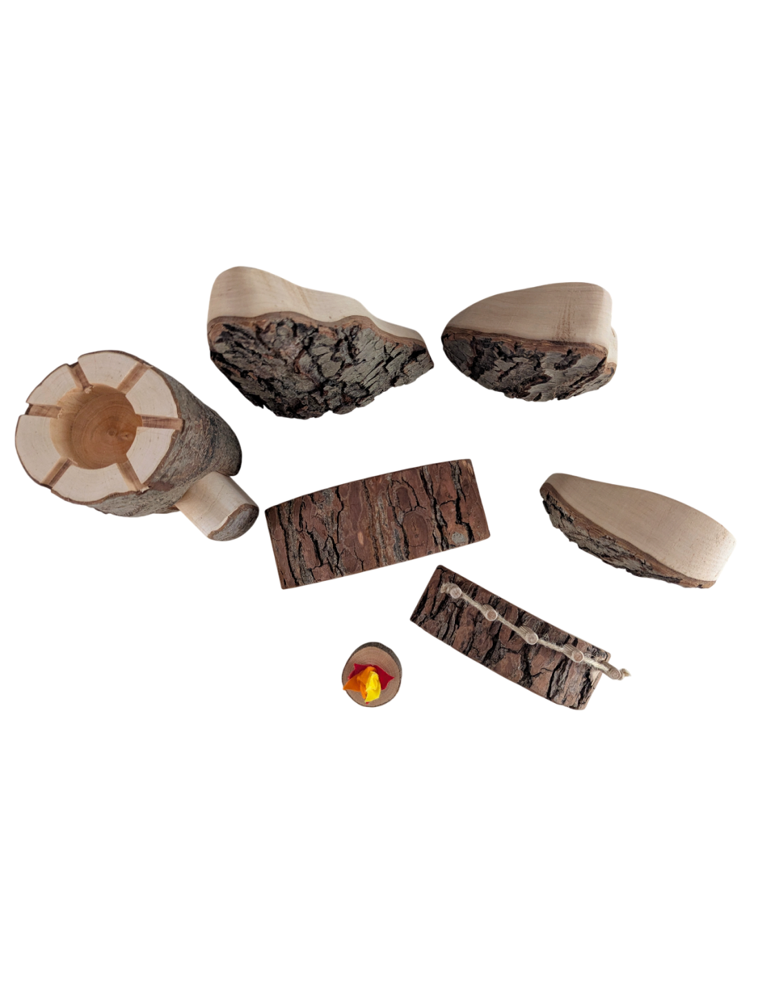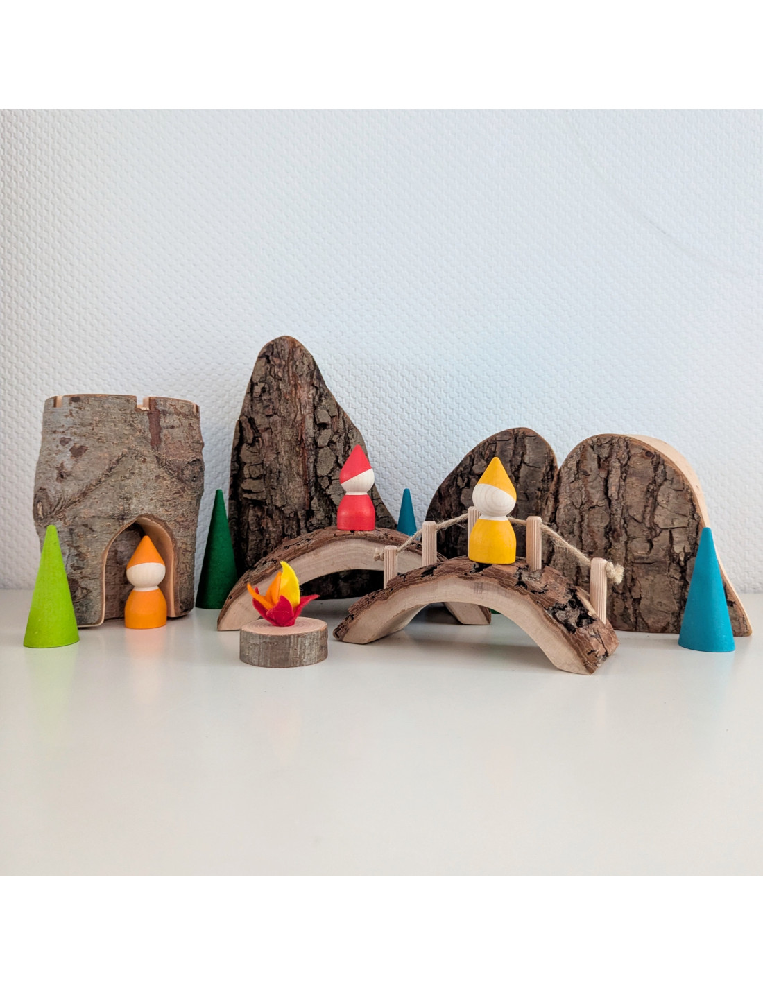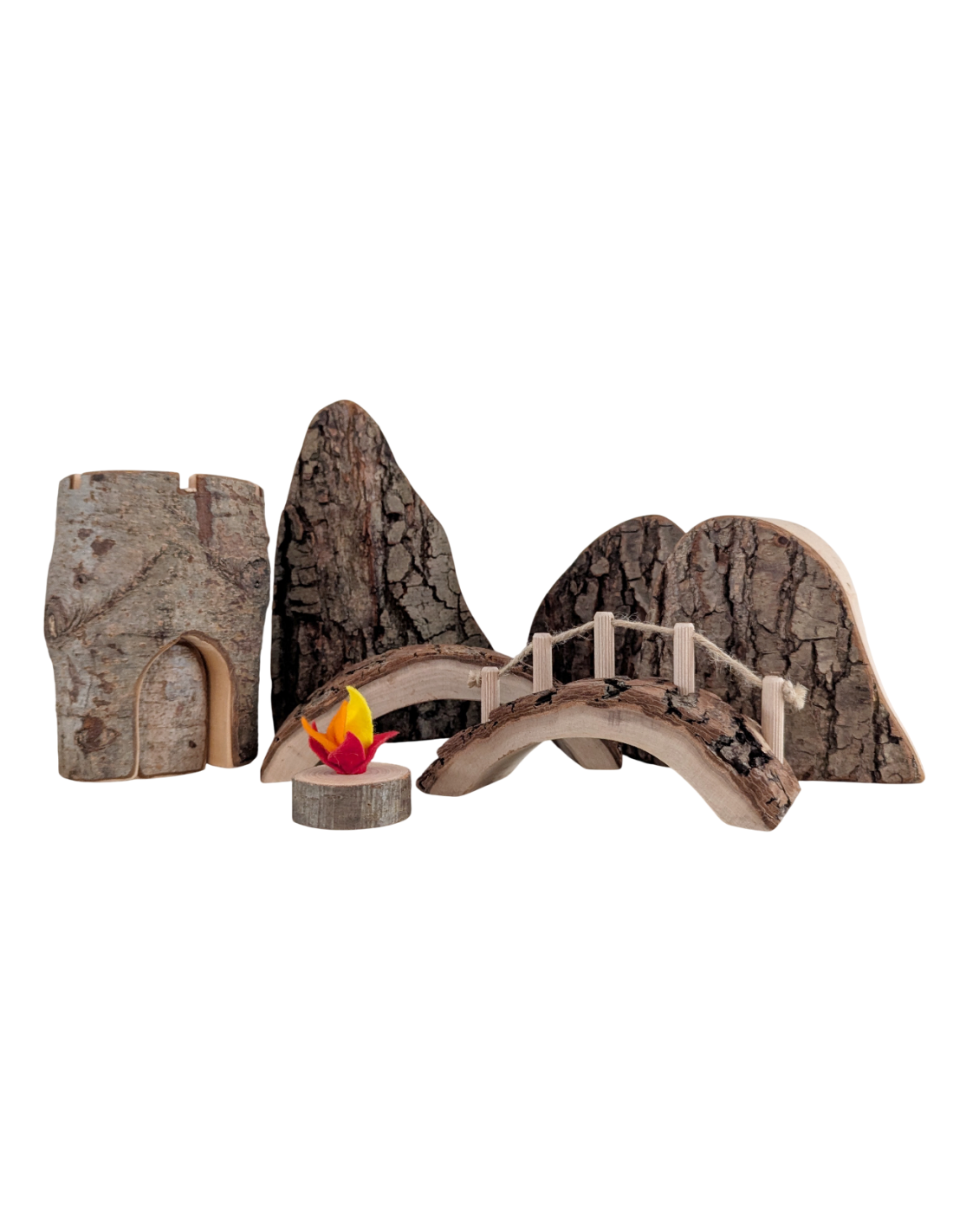 Deze geweldige set bestaat uit 3 indrukwekkend bergen met aan 1 kant houtbast en aan de andere kant onbewerkt hout, 2 bruggen waarvan 1 met een leuning, een kasteeltoren met losse deur en een houtblok met vuur. Super leuk om je speelwereld of seizoenstafel mee aan te kleden en eindeloze avonturen te beleven.