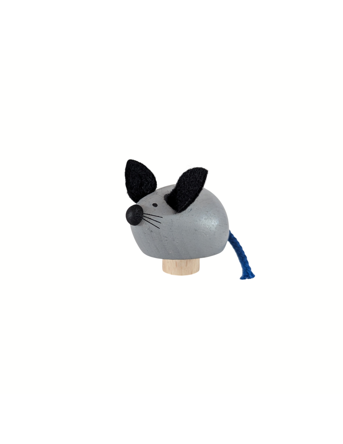 Kijk eens wie daar tevoorschijn piept? Jawel, het is dit leuke bolle muisje met zwarte vilten oortjes en een blauw koordje als staart welke op een houten stekervoet is geplaatst en zo geschikt is voor de verjaardagsring, bijvoorbeeld van ons eigen merk of van Grimm's.
