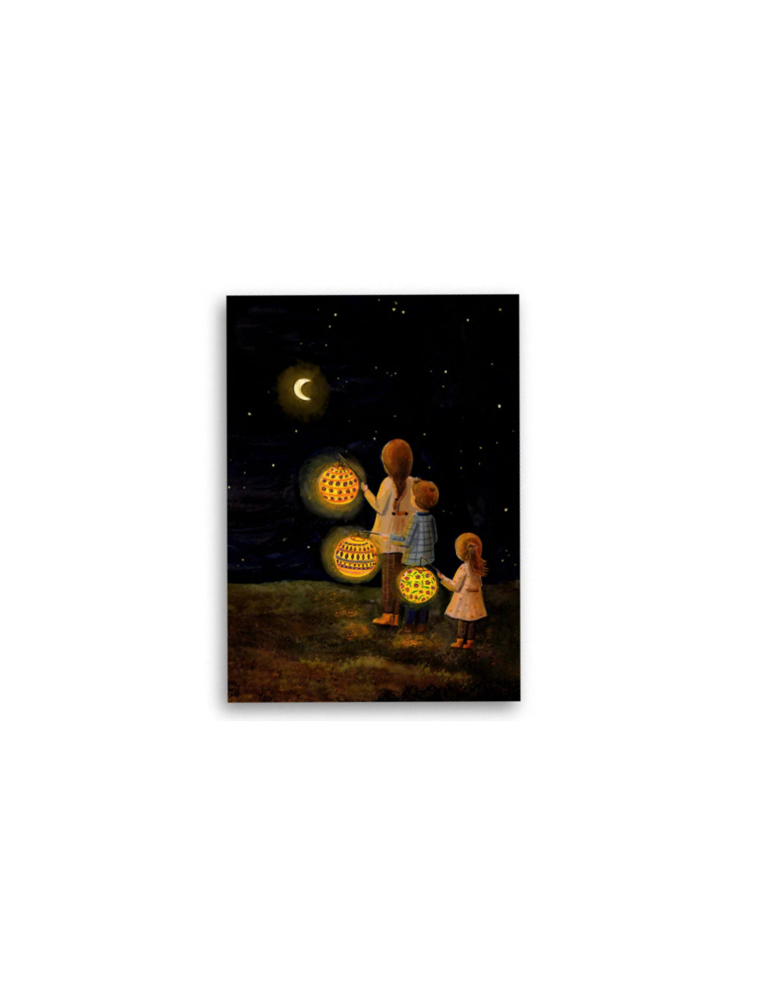 Een leuke ansichtkaart met drie kinderen met lampionnen van Esther Bennink