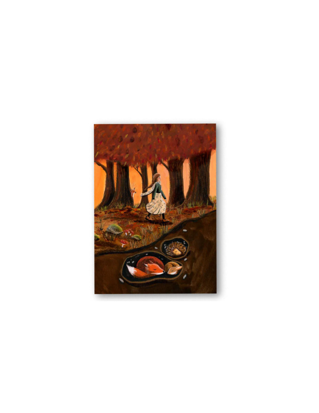 Het is herfst en terwijl de dieren onder de grond in hun holletje liggen is het meisje een herfstwandeling aan het maken. Deze kaart is een geweldige aanvulling voor elke (herfst) seizoenstafel en kan natuurlijk ook zeer goed als verrassing in je brievenbus gebruikt worden.