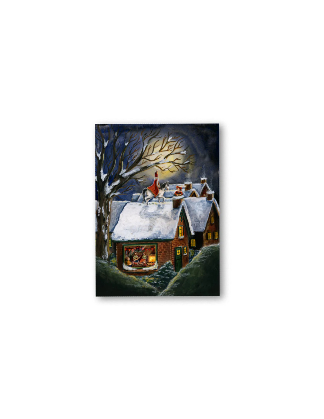 Sinterklaas is in het land en terwijl het gezin in de huiskamer luidkeels Sinterklaas liedjes aan het zingen is loopt Sinterklaas met zijn pietje op het dak. Deze kaart is niet enkel geweldig om neer te zetten als decoratie tijdens de sinterklaastijd, het is ook echt een geweldige verrassing in je brievenbus.