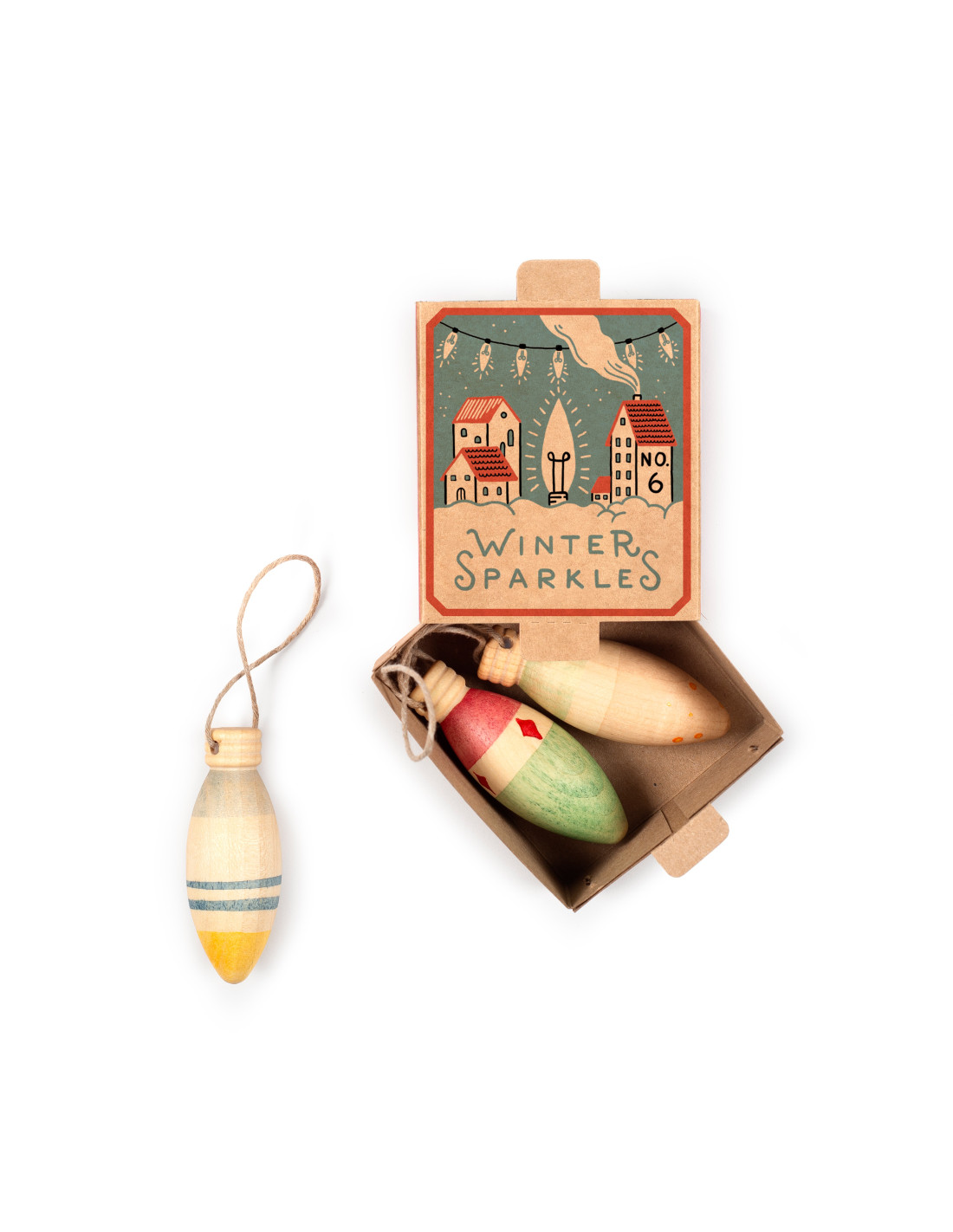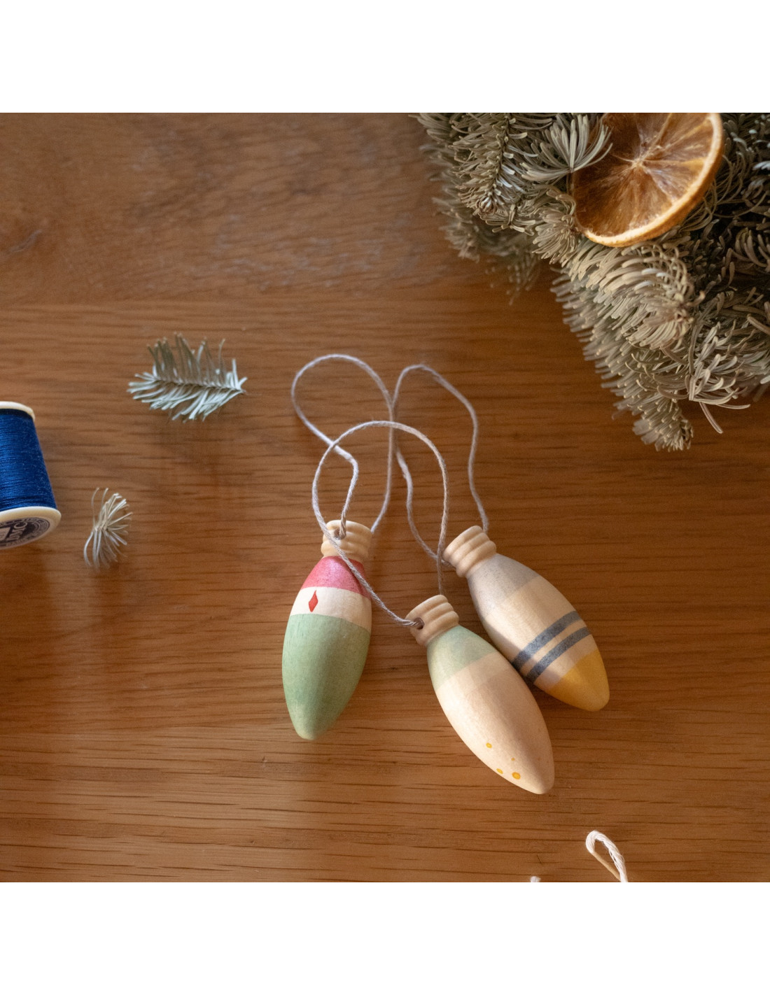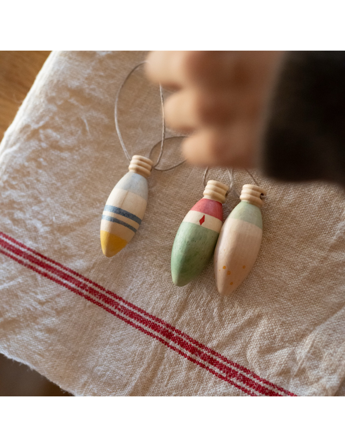 Een set welke bestaat uit 3 houten kerstboom hangers in de vorm van kerstboom lichtjes. De hangers zijn niet alleen geweldig van vorm, ze hebben ook een heel mooie kleur/ betekening en daarnaast zijn ze ook uitermate geschikt om gewoon lekker mee te spelen.