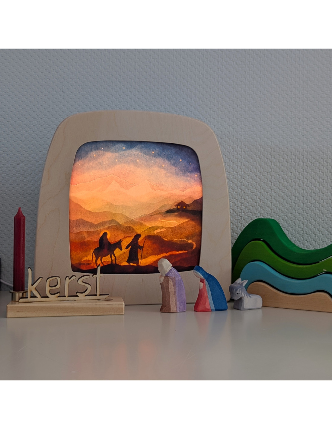 Klein maar oh zo fijn! Deze mini kerststal bestaande uit Maria, Jozef, een kribbe met de kleine Jezus, een liggende os en een liggende ezel heeft alles wat je nodig hebt om een klein hoekje in huis in kerstsfeer onder te dompelen. De set is met de hand gesneden en gekleurd en kan zowel als decoratie als voor speelgoed dienen. Daarnaast wordt ze geleverd in een stevig houten frame met een plexiglas deksel om hem weer in te pakken tot de volgende kerst.