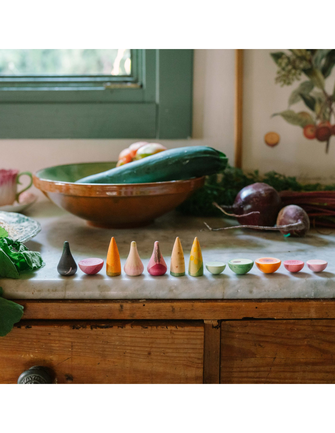 Ze zijn klein maar oh zo leuk. Deze houten groenten set bestaat onder ander uit: een halve tomaat, een halve ui, een wortel en een bietje en is geweldig om eindeloos plezier mee te beleven. Of je er nu keukentje mee wilt spelen, een restaurant na wil bouwen of een "gezonde" mandala mee wilt neerleggen, dit is de set die je zoekt!