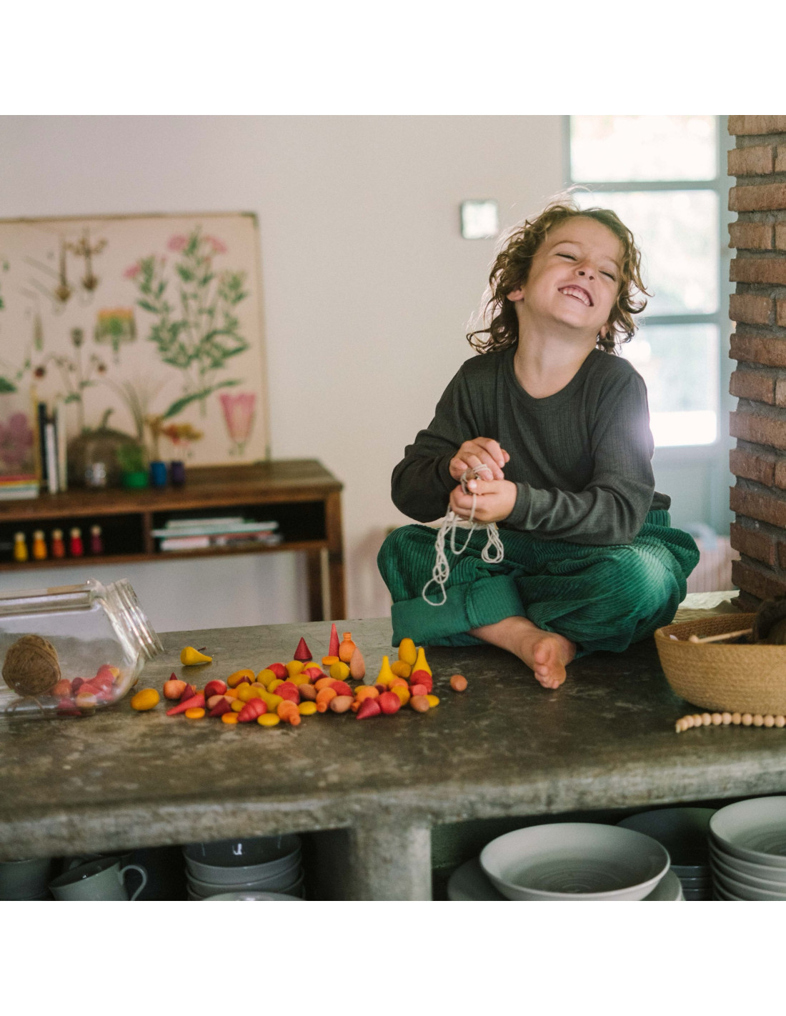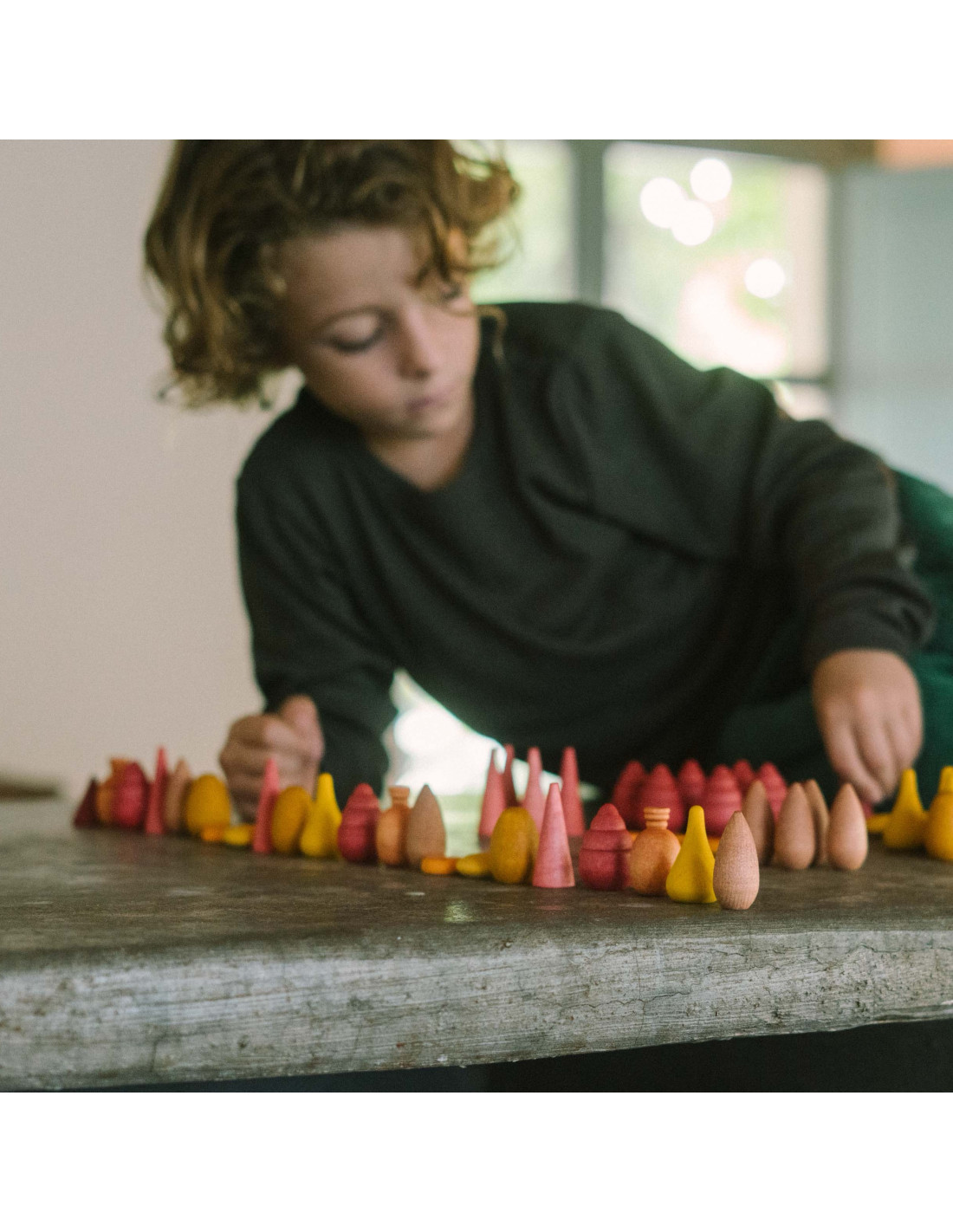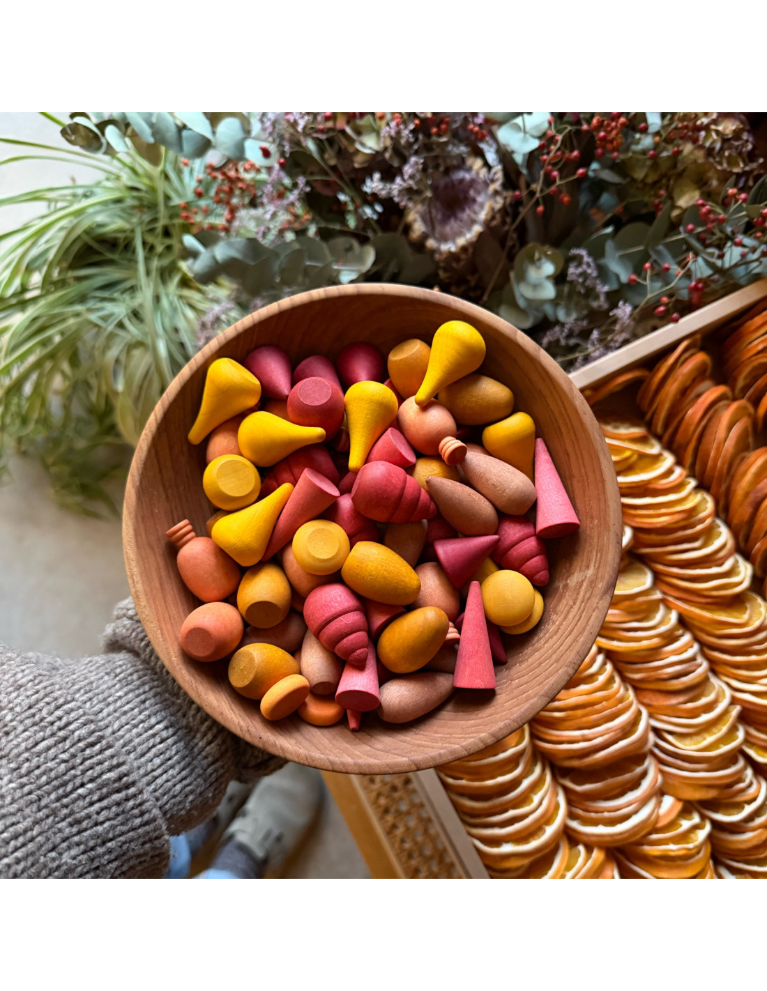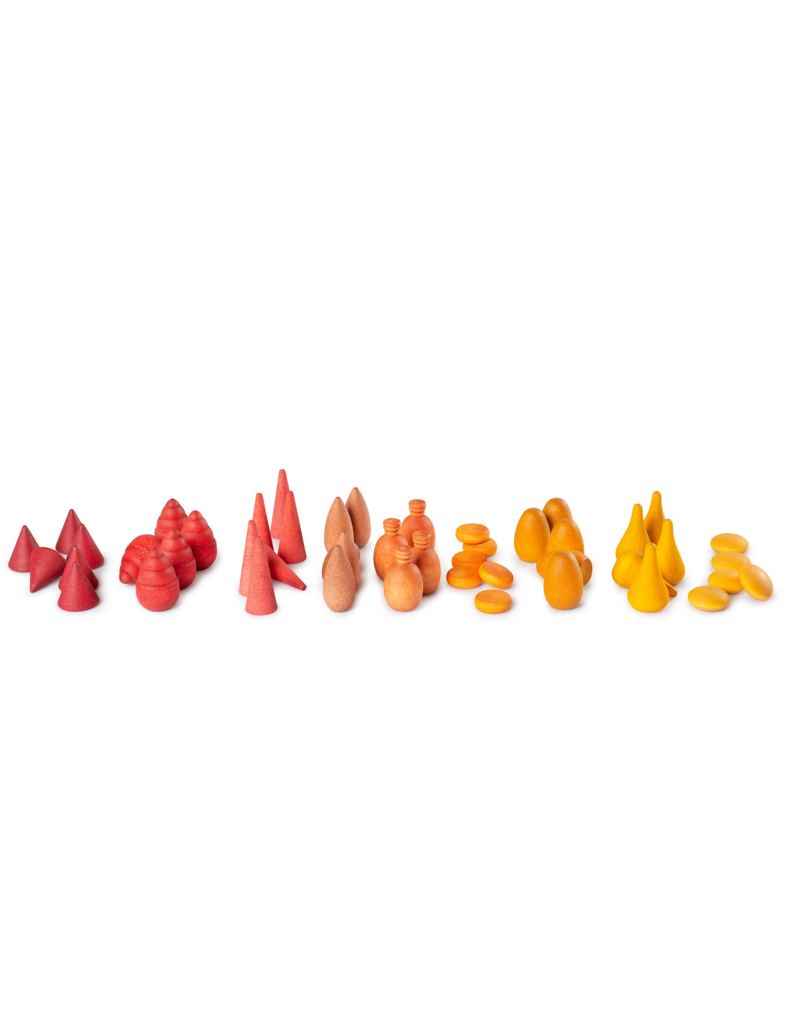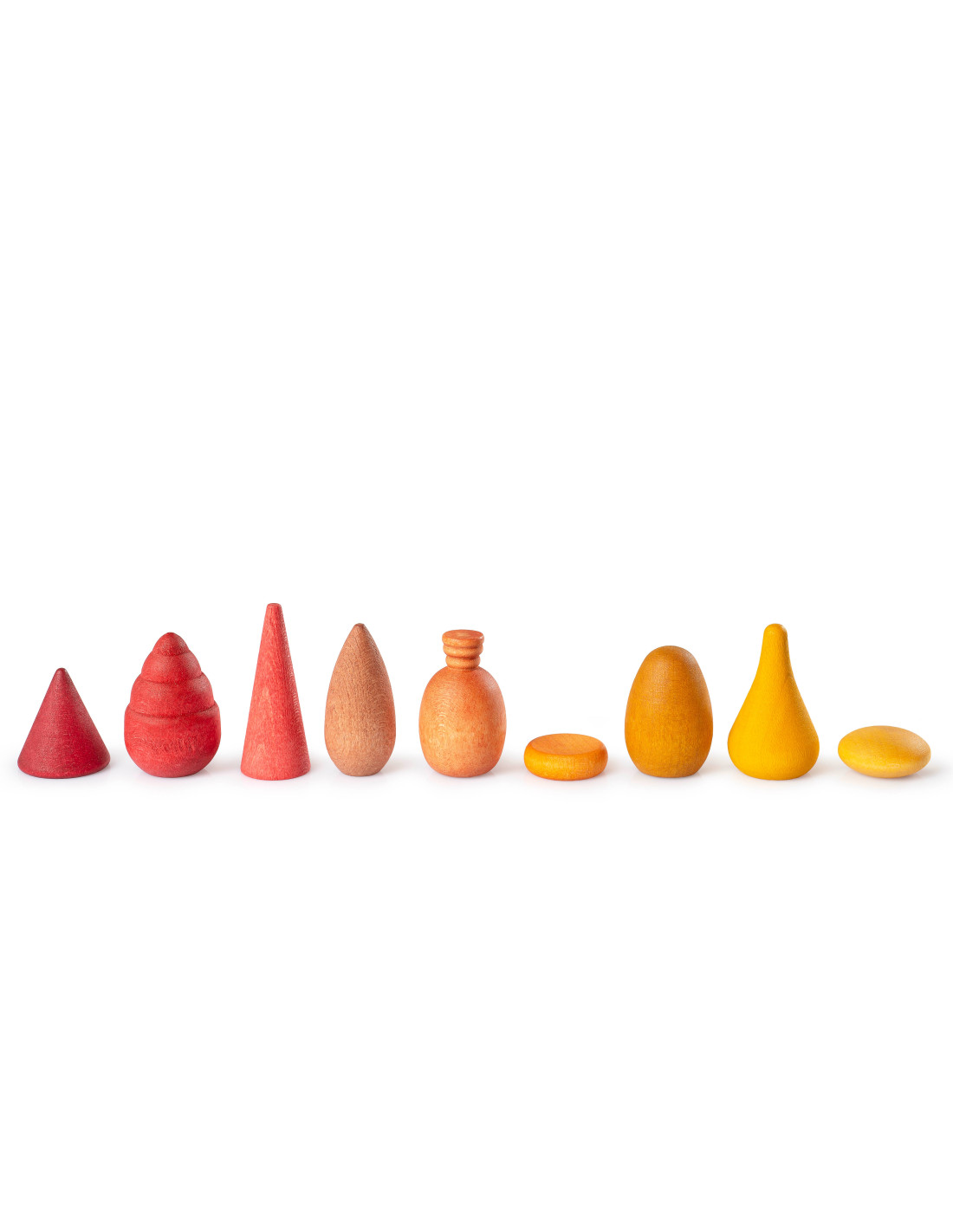 Wil jij beginnen met een mandala figuurtjes verzameling om zo je loose parts verzameling aan te vullen? Dan is deze set met 9 verschillende vormen in allen een andere warme kleur precies wat je nodig hebt. Bij de houten figuurtjes zit onder andere een ei, een kruik, twee soorten kegels en een boompje. Geschikt voor het maken van de mooiste mandala's of figuren.