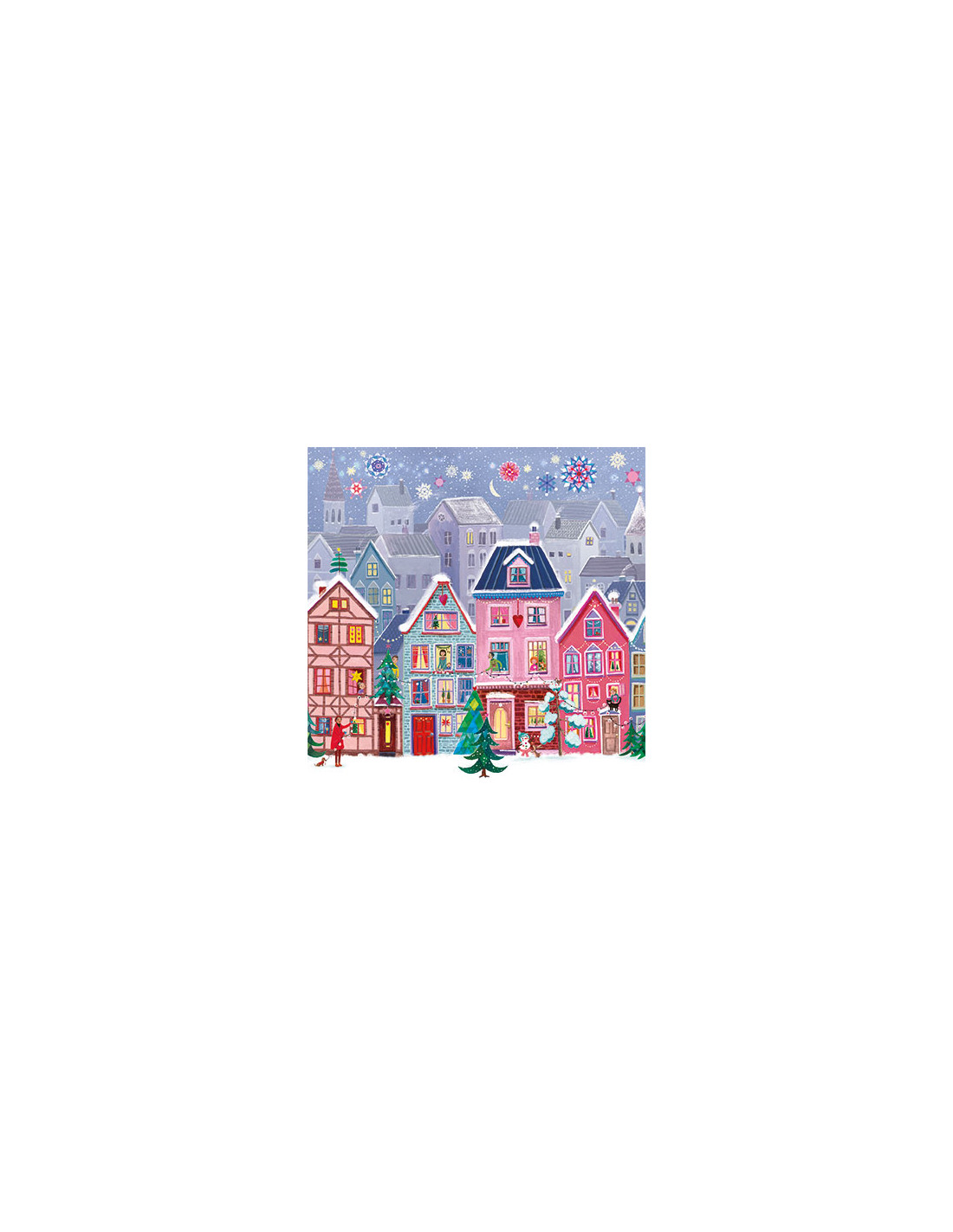 Het is oud en nieuw en boven de versierde kersthuizen is het vuurwerk al losgebarsten. Deze vrolijke (kerst)kaart is een feestje om te verzenden of om neer te zetten, bijvoorbeeld bij de jaarwisseling. De kaart is vierkant van maat en afgewerkt met glitter voor een extra luxe effect.