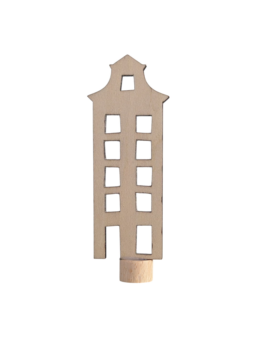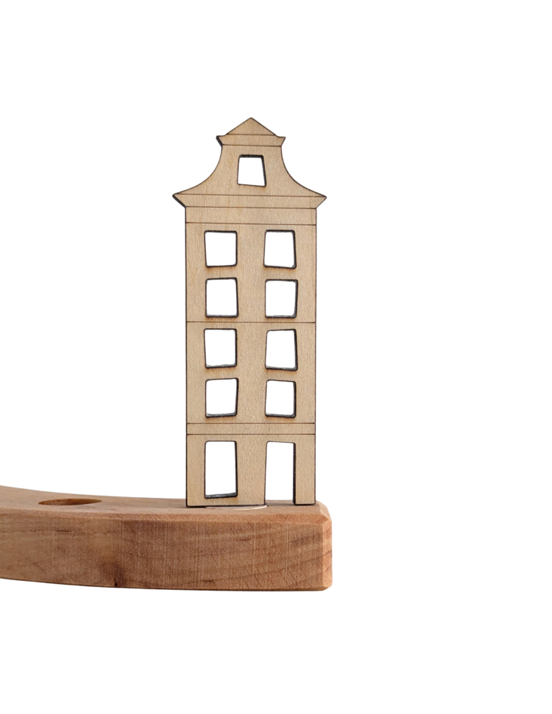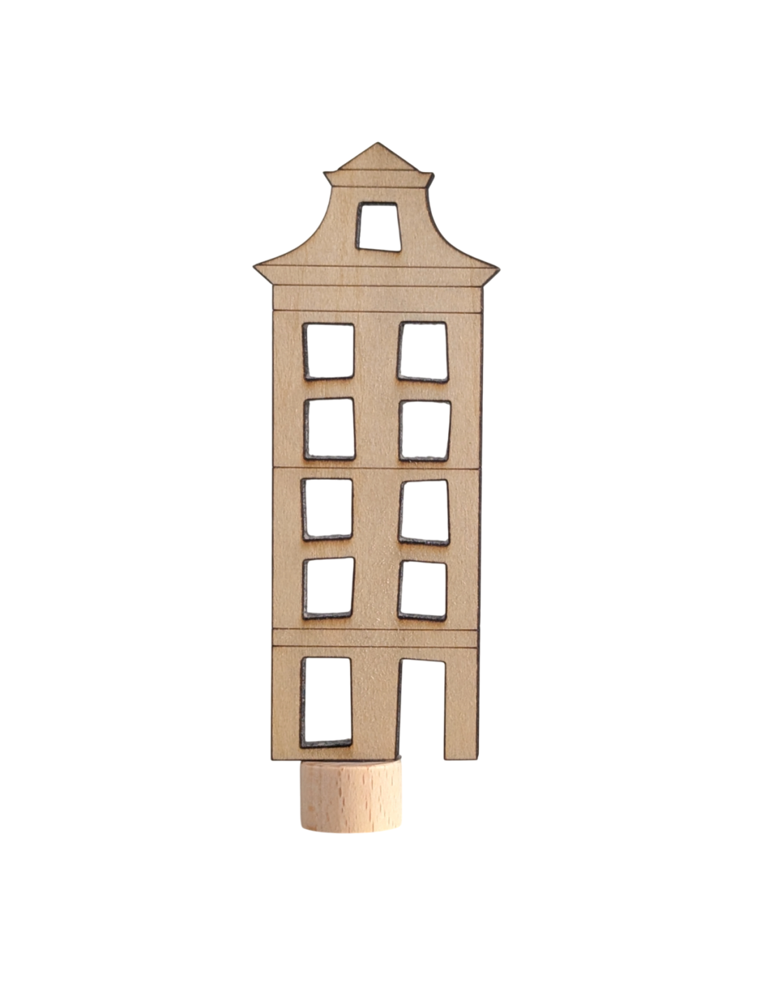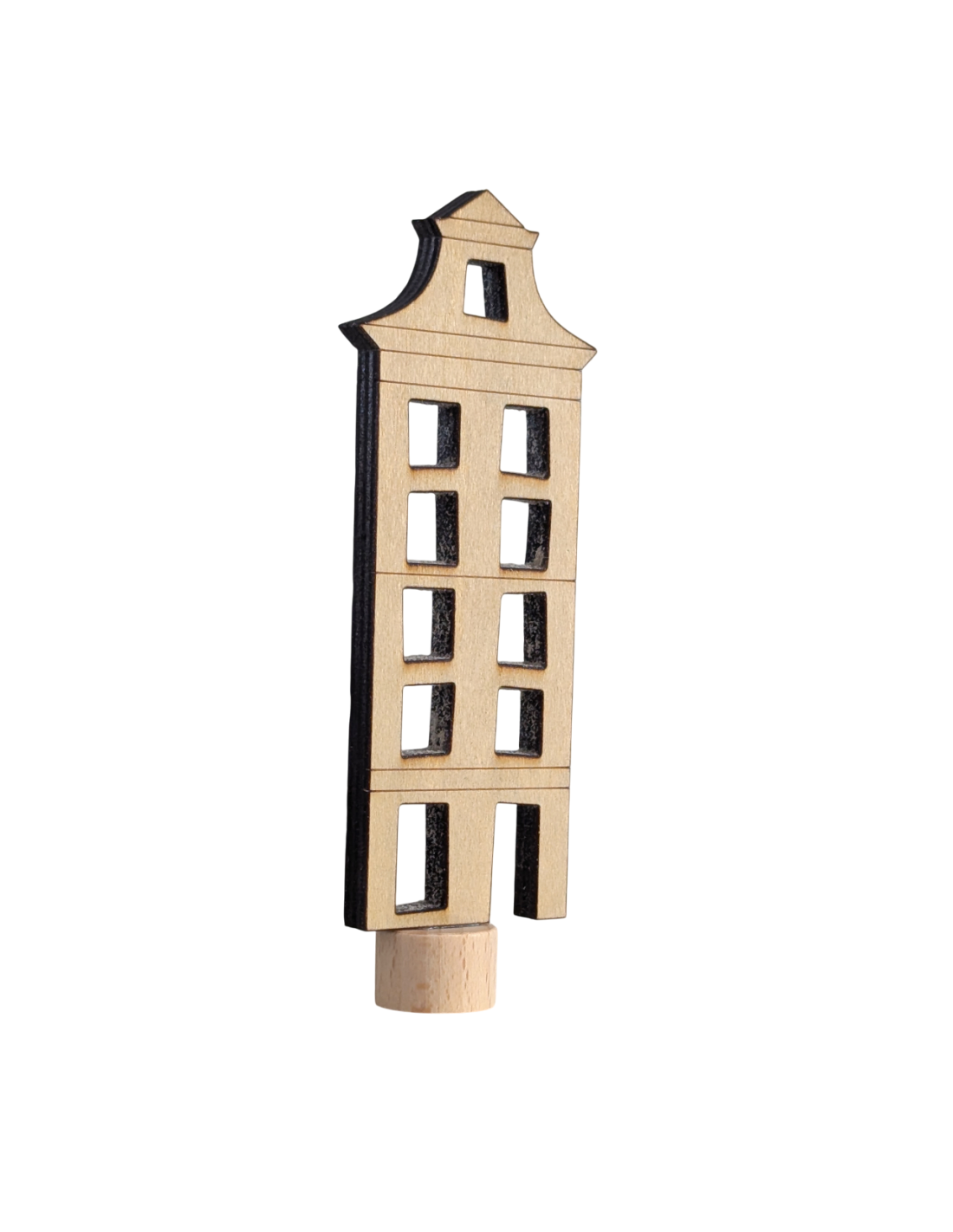 Houten steker in de vorm van een grachtenpand voor in de verjaardagsring van bijvoorbeeld Grimm's van ons eigen Houtspel merk