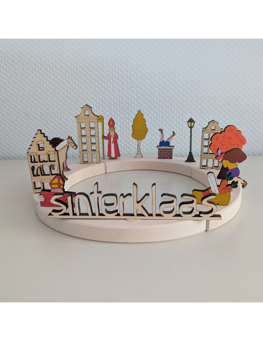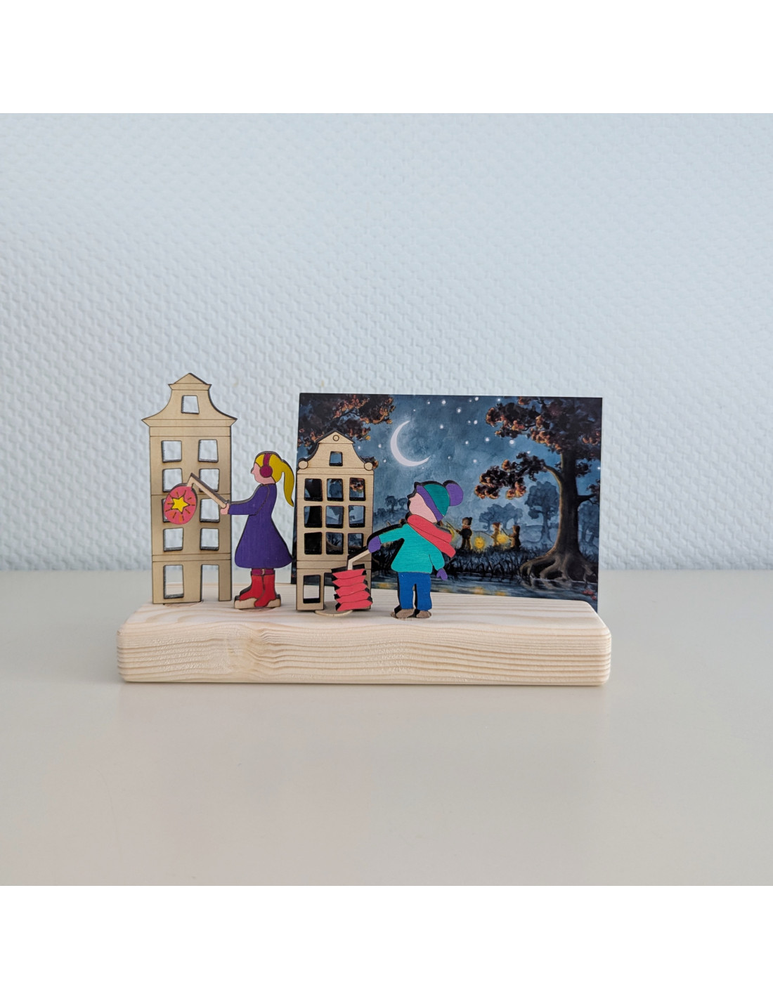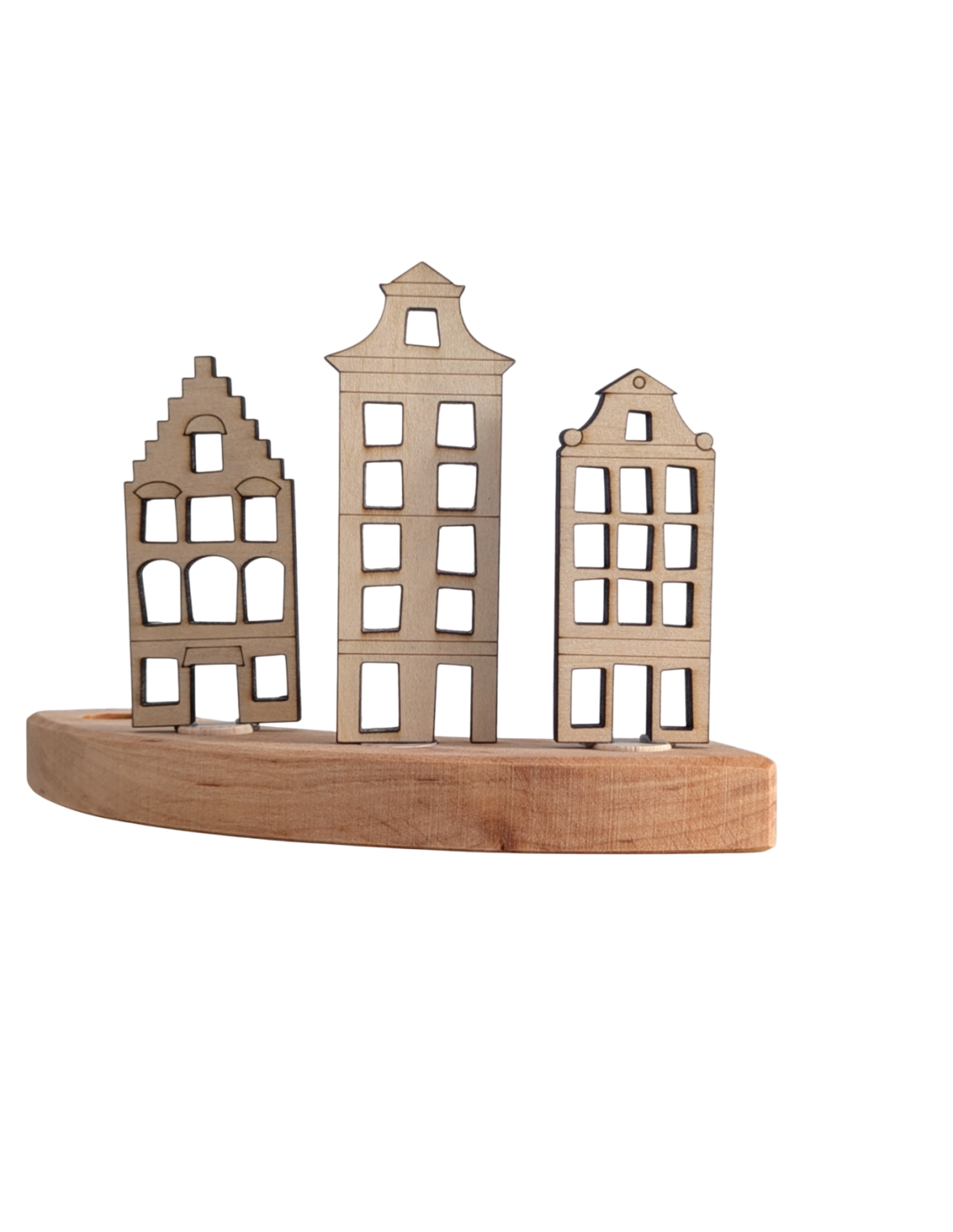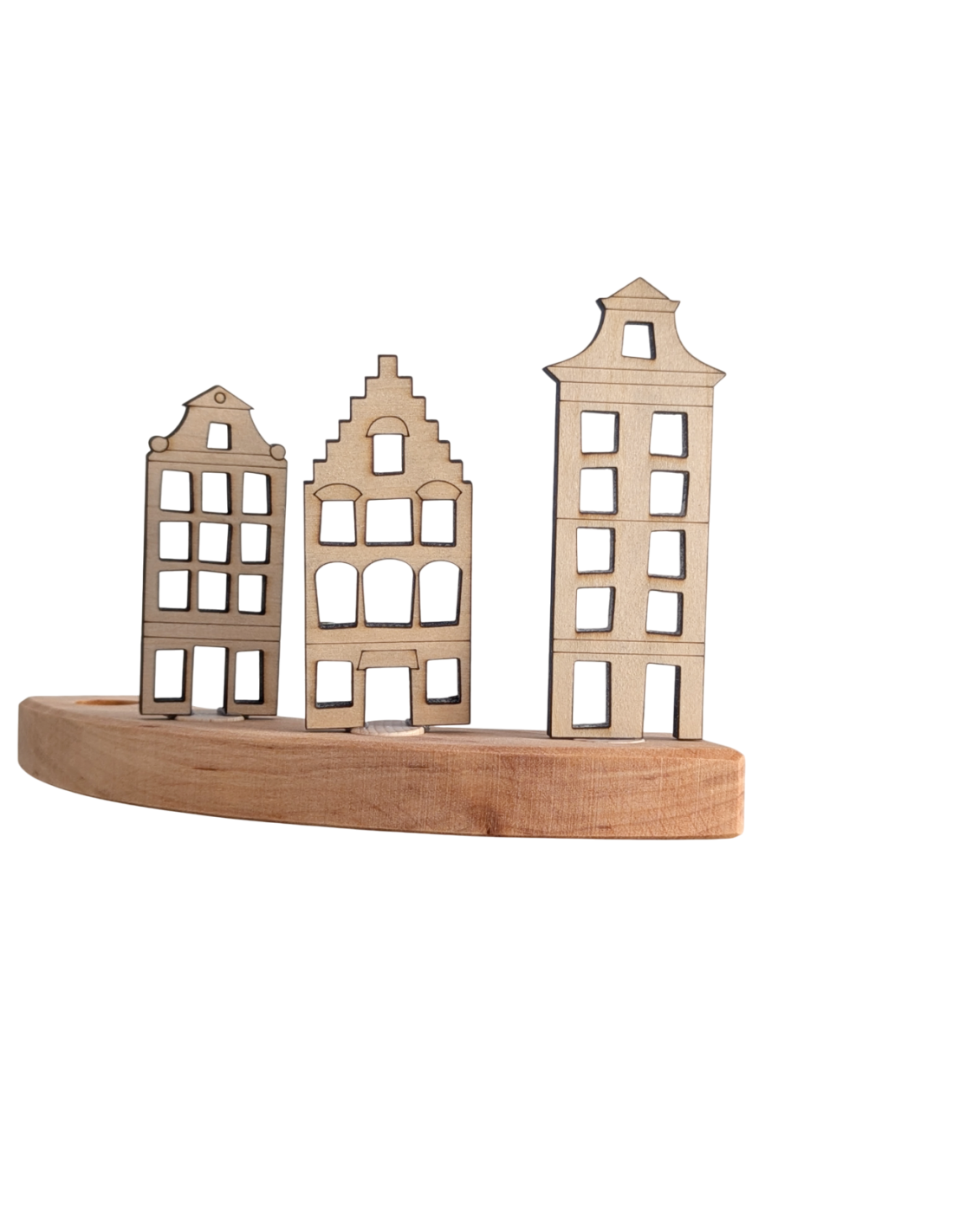Houten steker in de vorm van een grachtenpand voor in de verjaardagsring van bijvoorbeeld Grimm's van ons eigen Houtspel merk