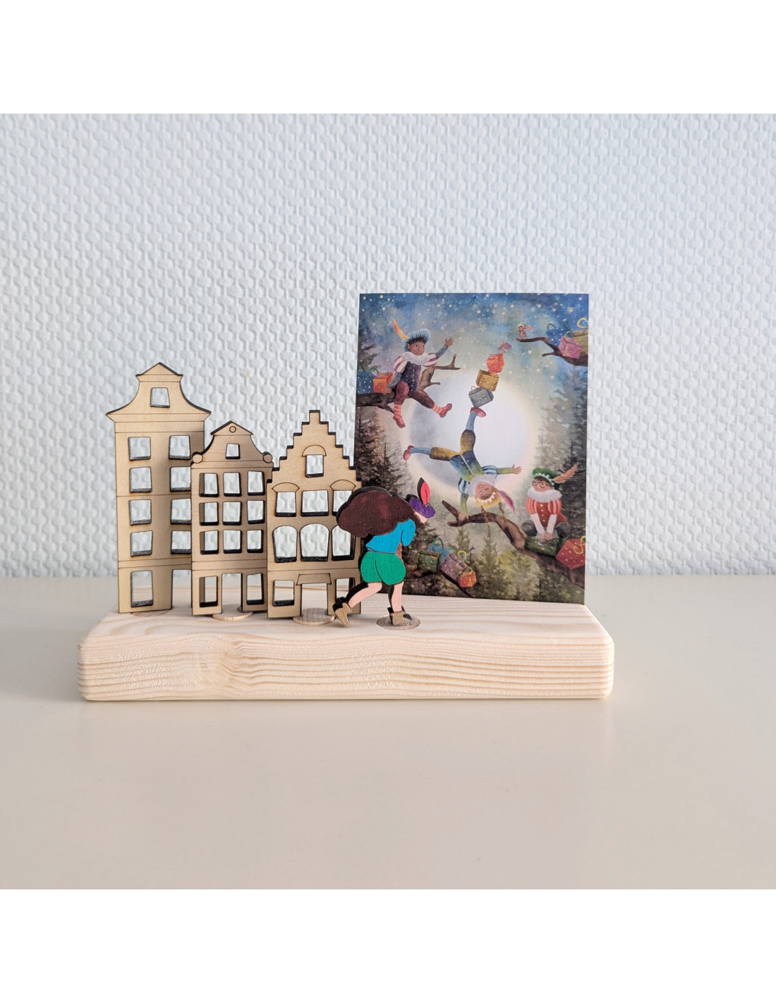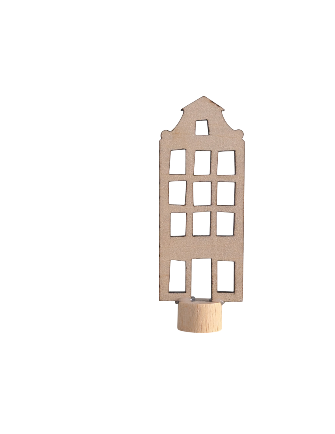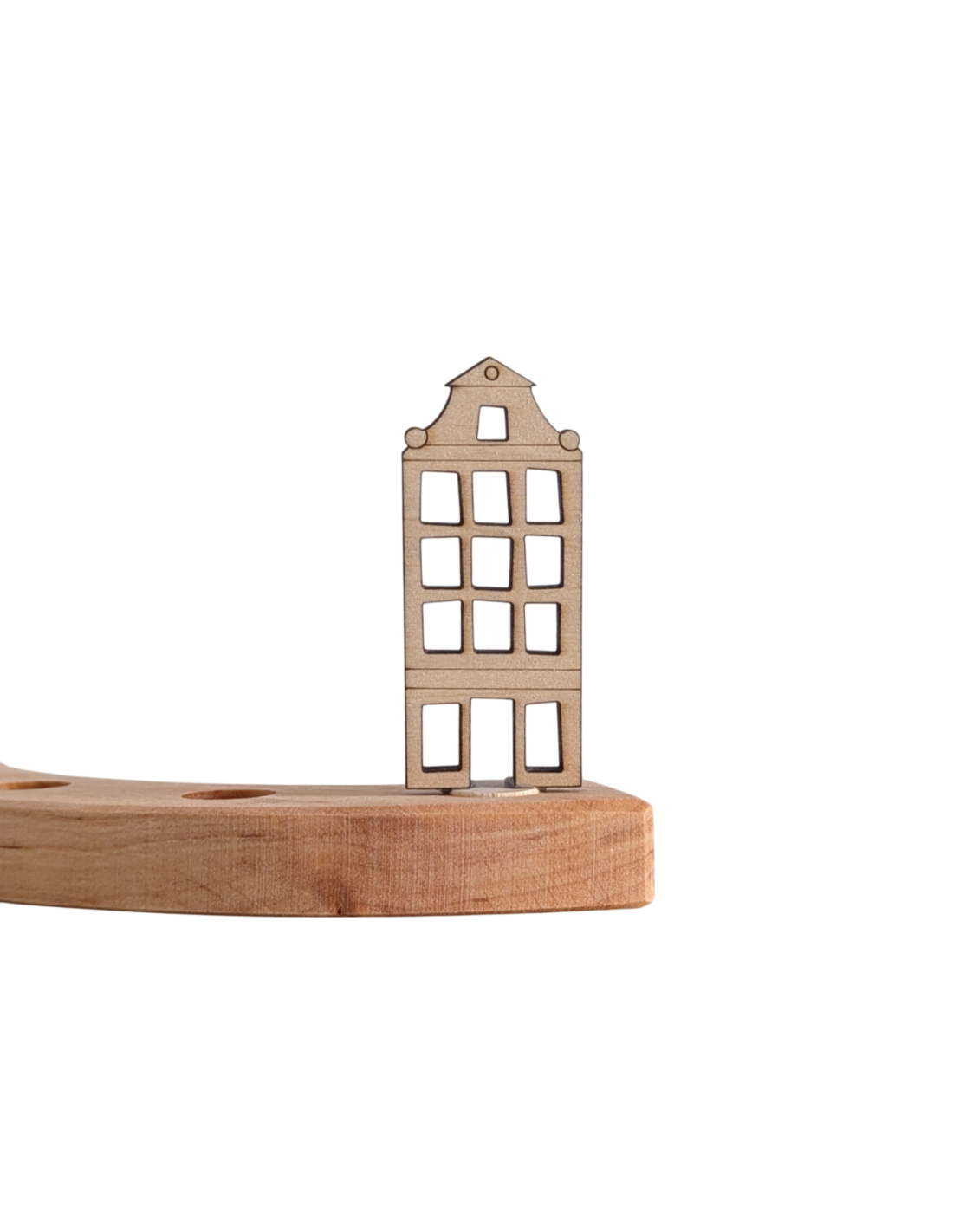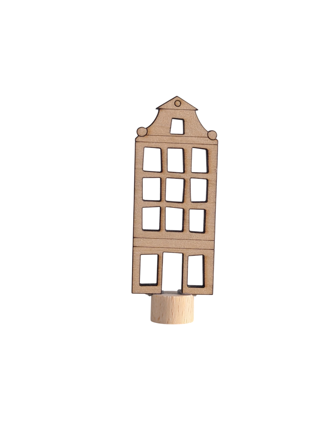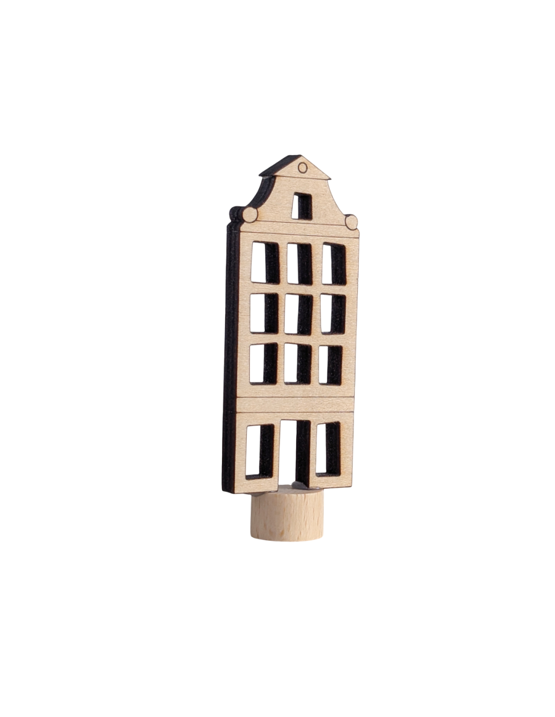 Een leuke houten steker voor in de verjaardagsring van bijvoorbeeld Grimm's in de vorm van een klein grachtenpand van ons eigen Houtspel merk