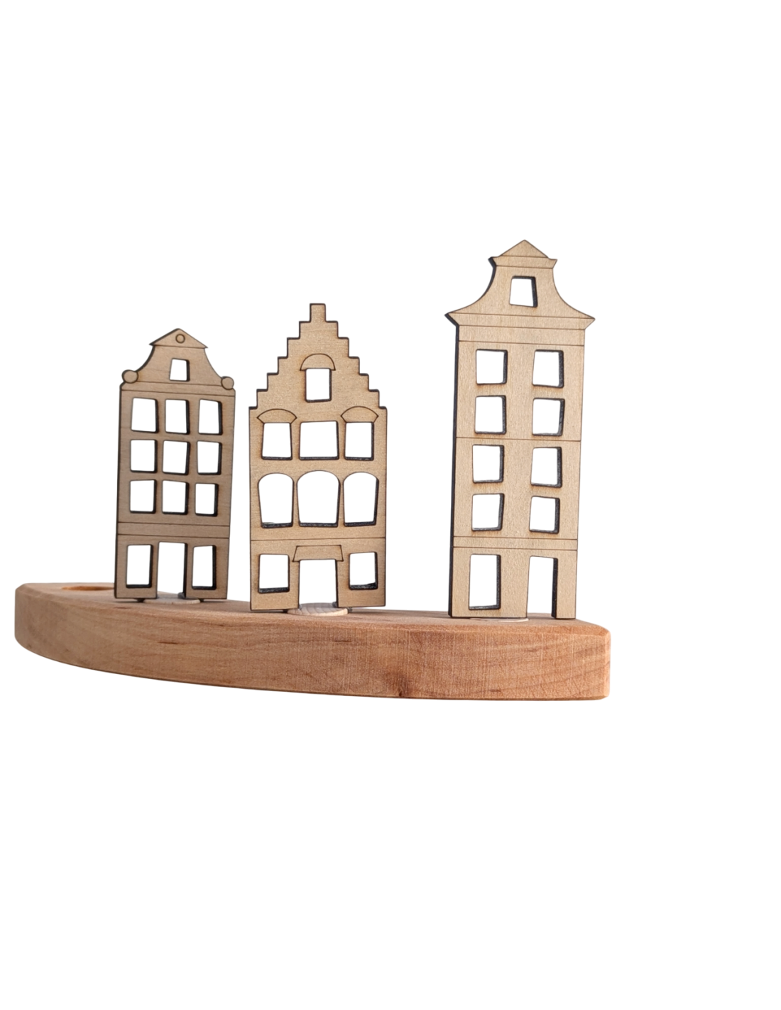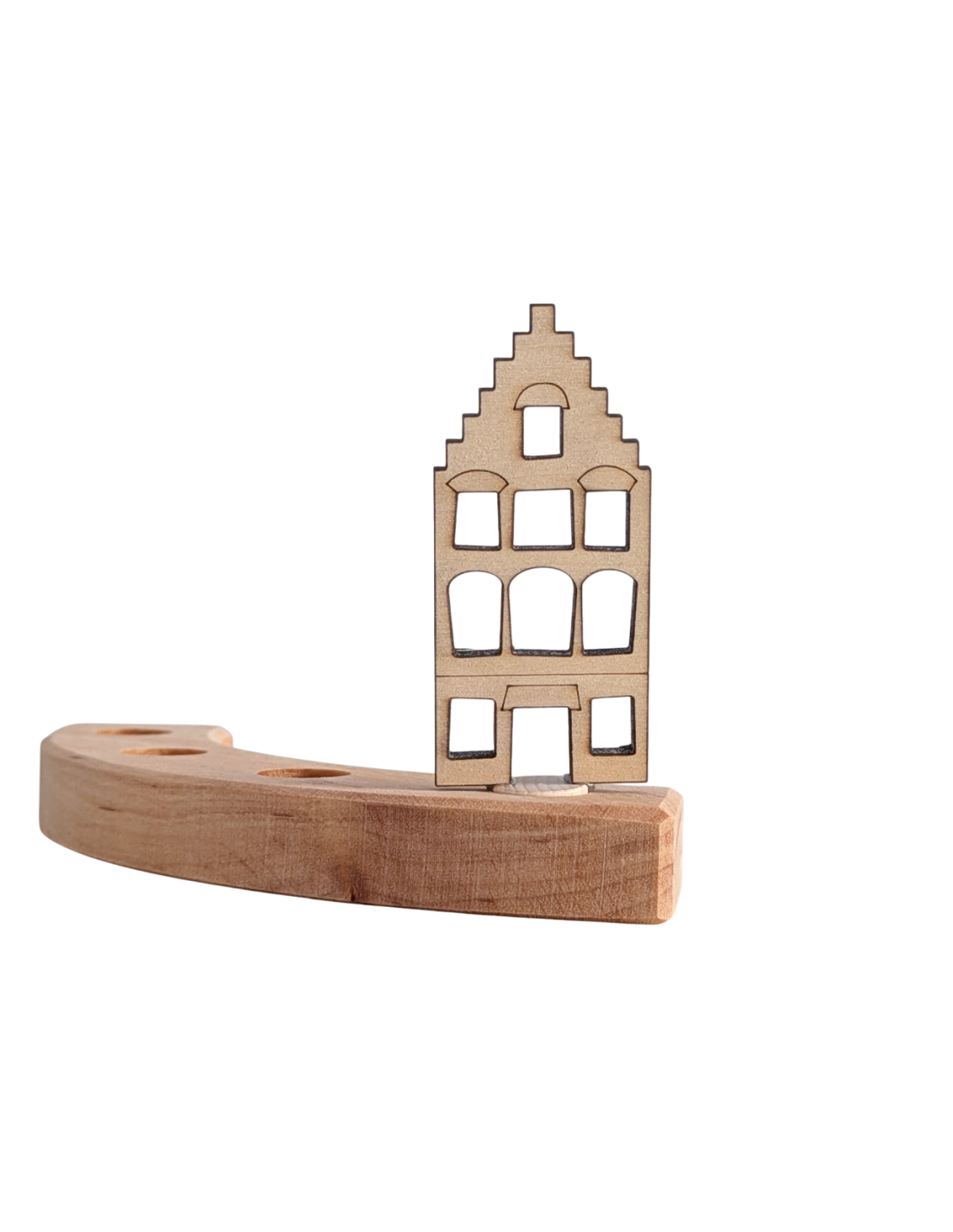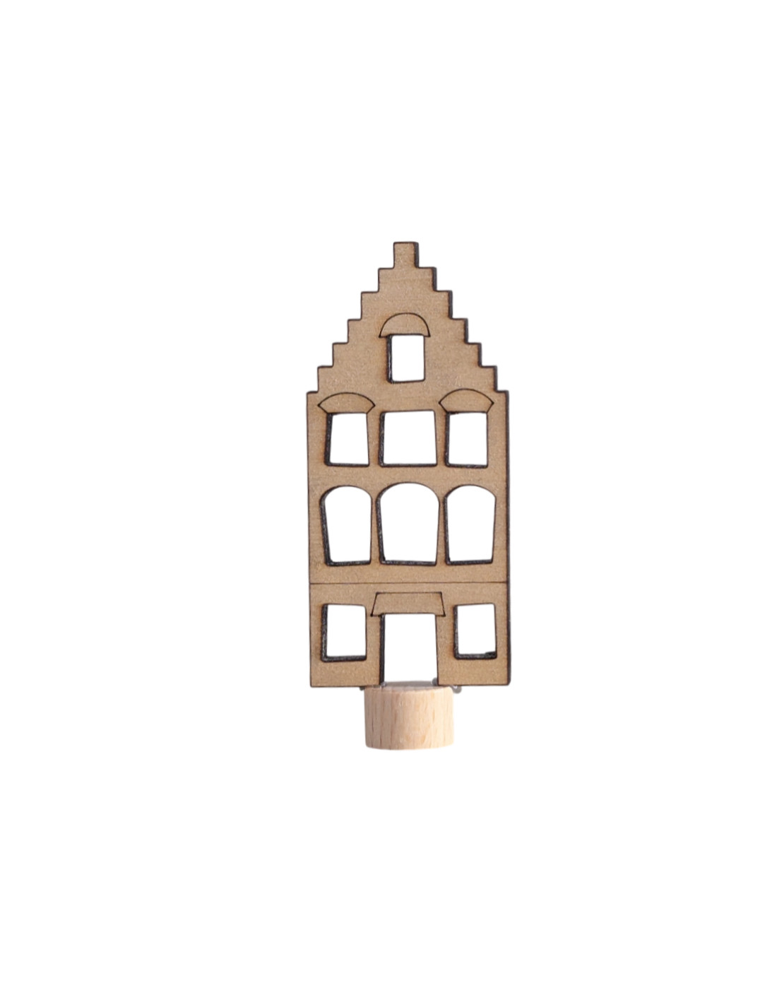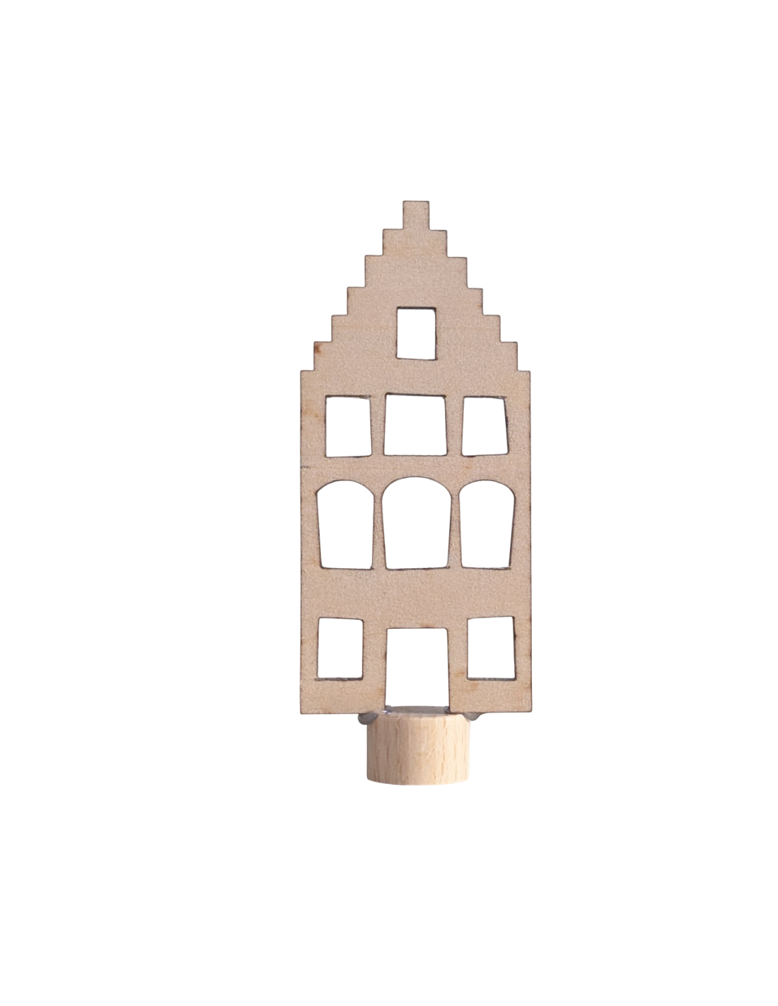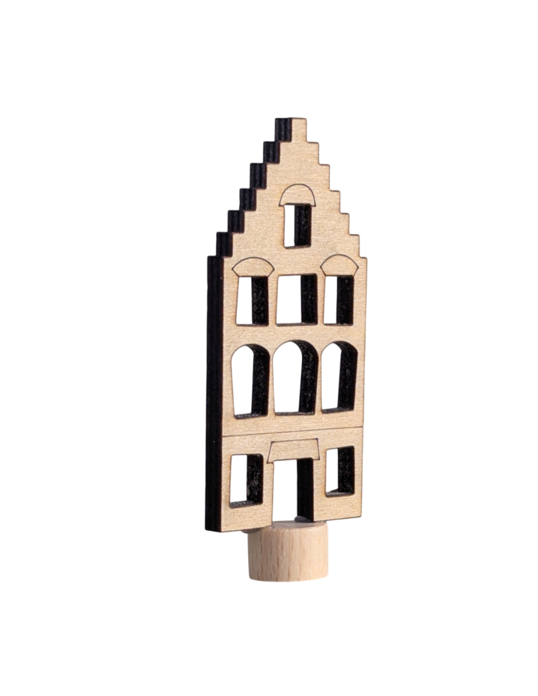 Houten steker in de vorm van een grachtenpand met trapgevel voor in de verjaardagsring van bijvoorbeeld Grimm's van ons eigen Houtspel merk