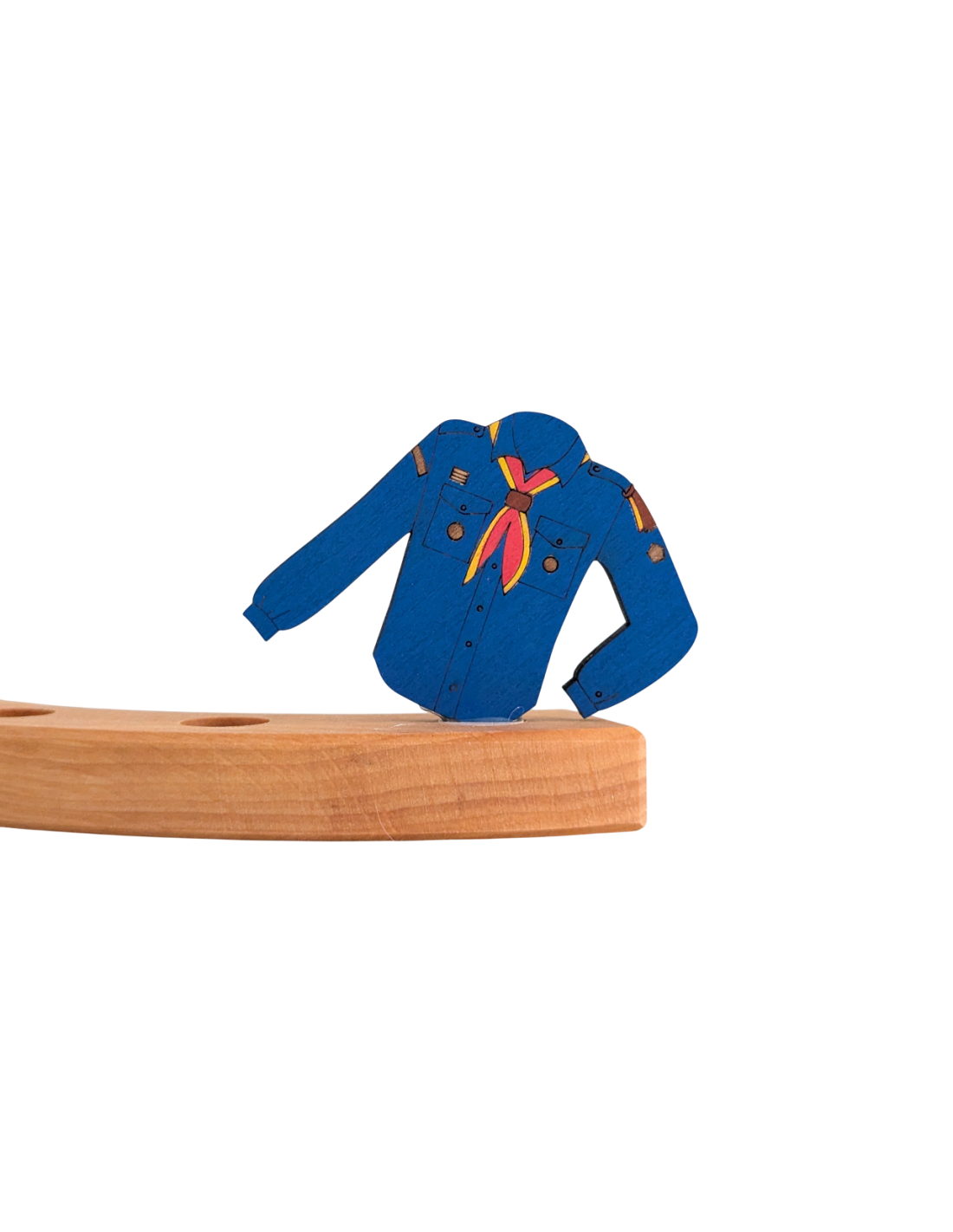 Een leuke houten steker in de vorm van een blauwe scouting blouse van ons eigen Houtspel merk