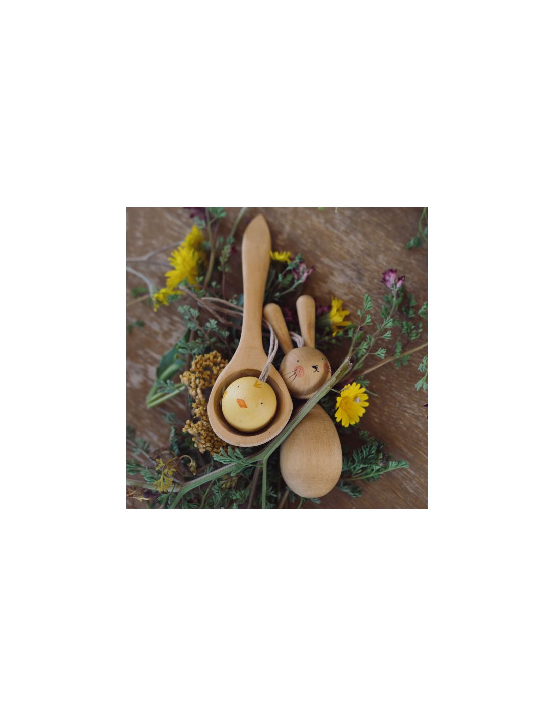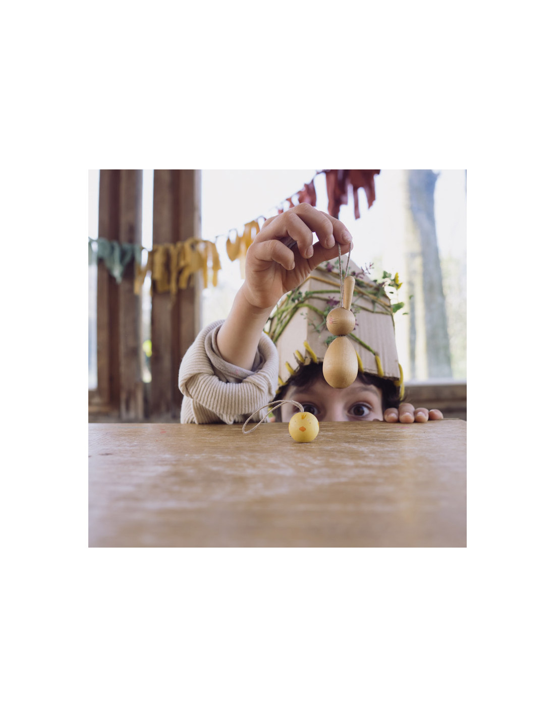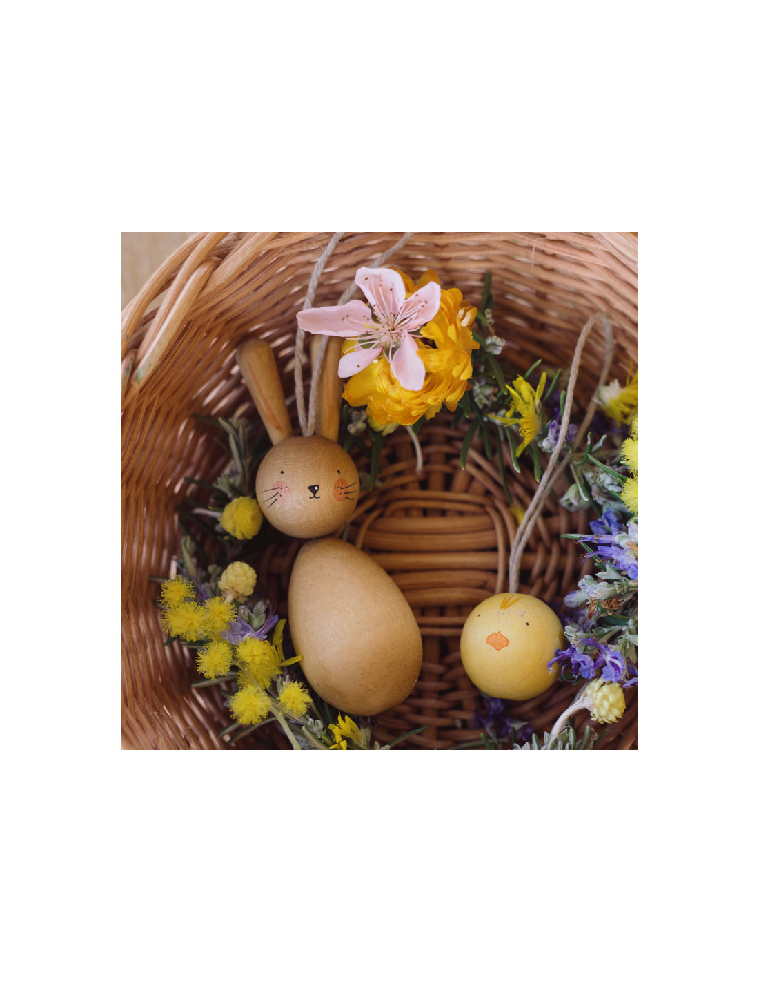 Deze set met een kleine houten paashaas en een rond kuikentje met een touwtje om op te hangen is een feest om te gebruiken rond de paasdagen. Gebruik de hangers bijvoorbeeld in je seizoensboom of versier er je paastakken mee. En natuurlijk is de set ook geweldig te gebruiken om gewoon lekker mee te spelen.