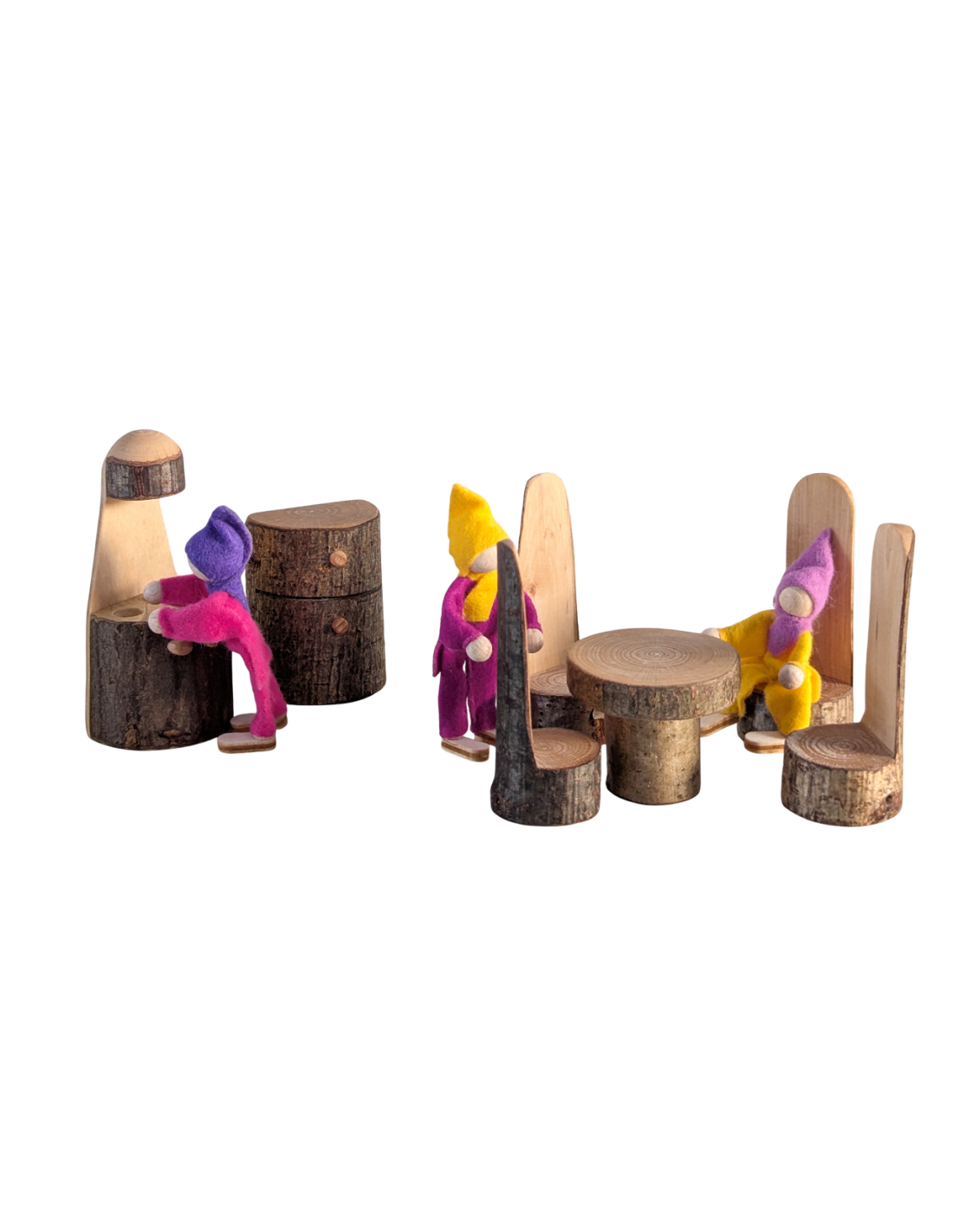 Ziet er leuk uit! Staat erg mooi in boomschors poppenhuizen. Minder geschik voor het gebruik met peg dolls. De zittingen van de stoeltjes zijn daar niet ruim genoeg voor: valt om. Met pijpenragerpoppetjes gaat het beter, maar die blijven weer minder goed voor het fornuis staan. Maar er wordt graag mee gespeeld en de meubeltjes worden ook gebruikt op de jaartafel.