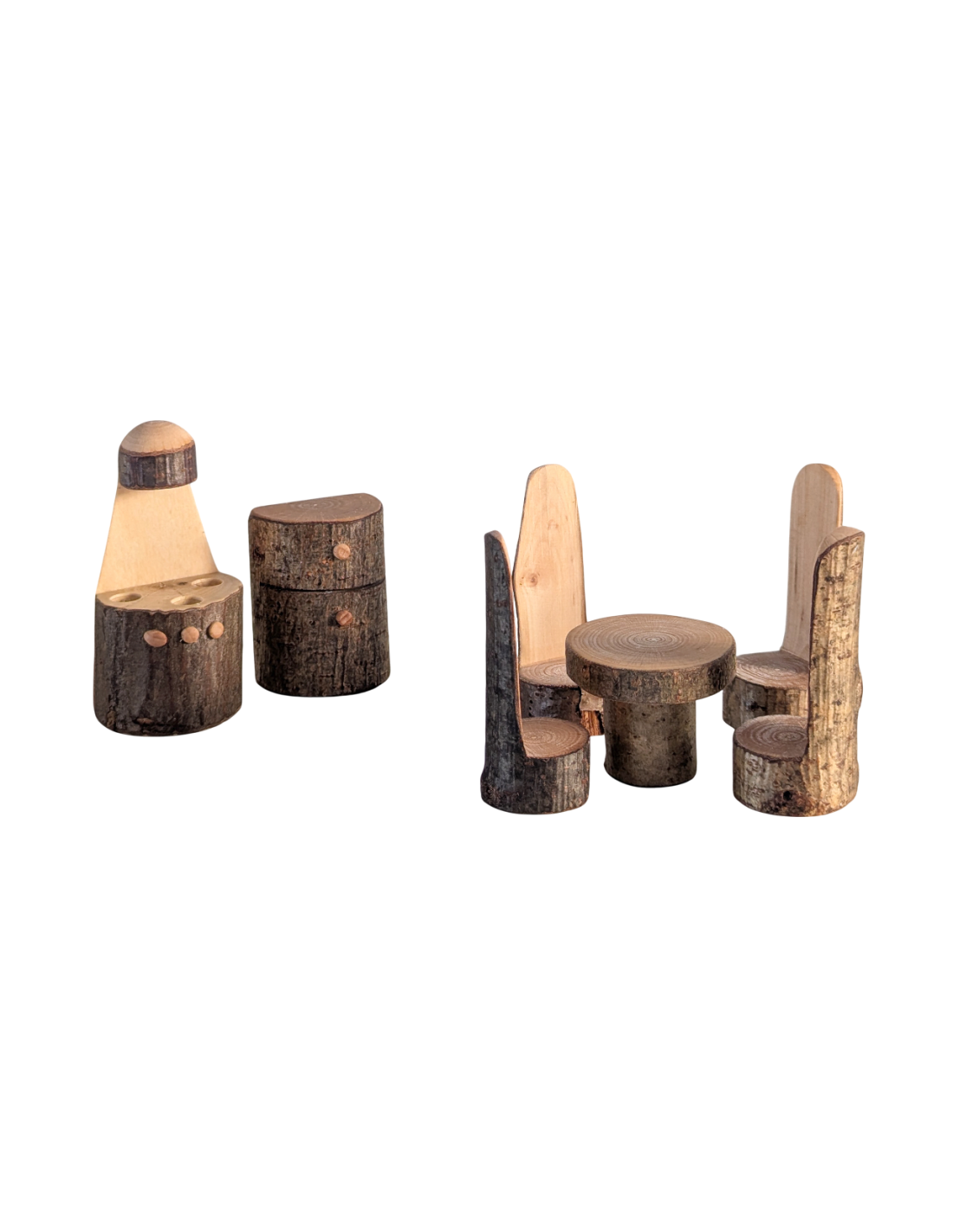 Deze 7 delige houten poppenhuis keuken set bestaat uit een keukentafel met 4 stoelen, een gasfornuis en een keukenkastje. De meubeltjes zijn gemaakt uit boomstammetjes met de bast er nog aan voor een extra natuurlijk uiterlijk. De meubeltjes zijn qua maat uitermate geschikt voor in het poppenhuis Waldorf.
