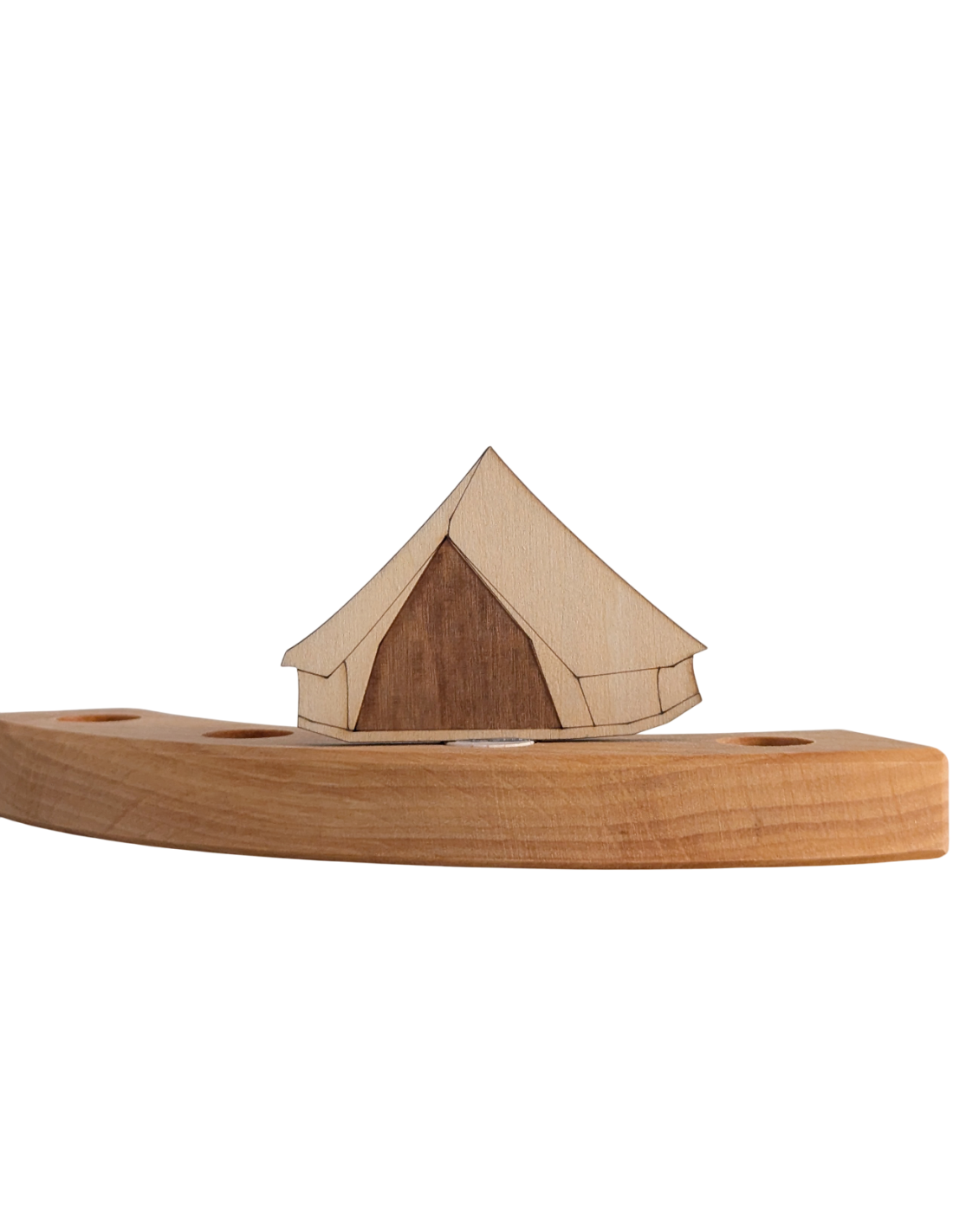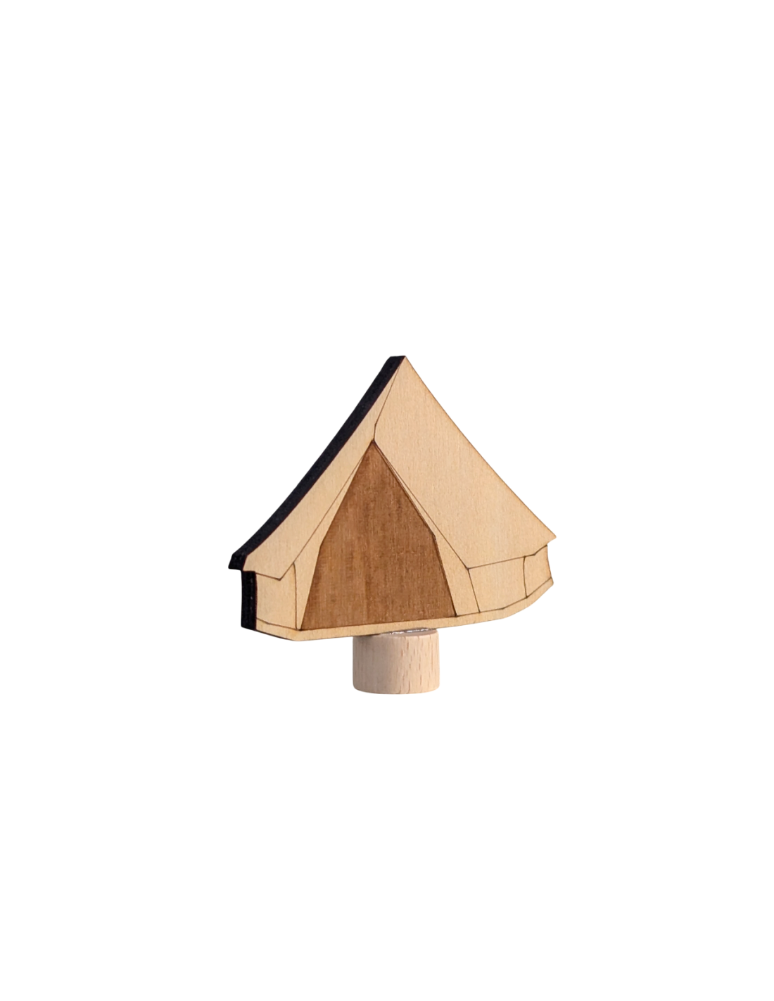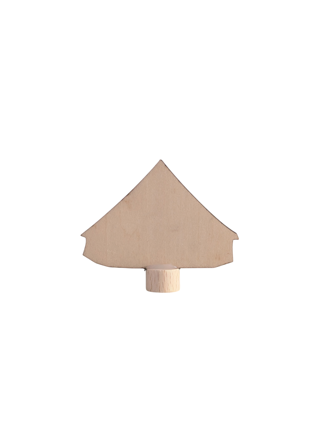 Een houten scouting steker in de vorm van een tent van ons eigen Houtspel merk