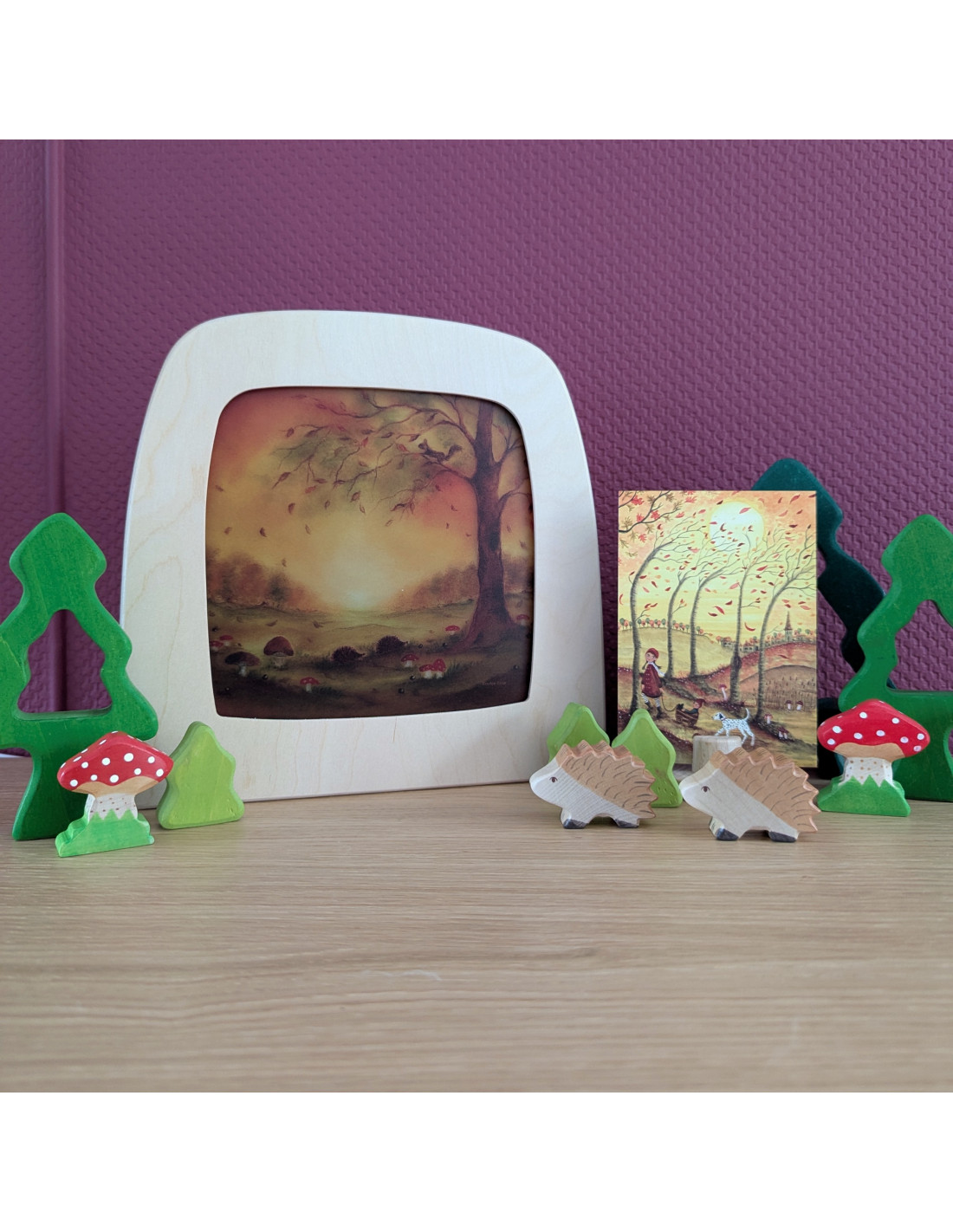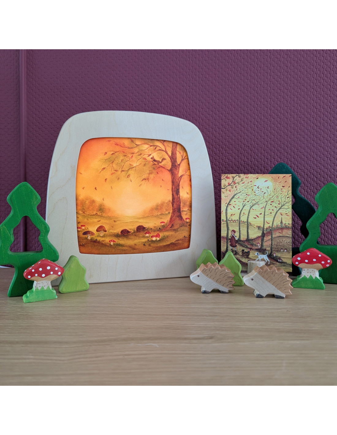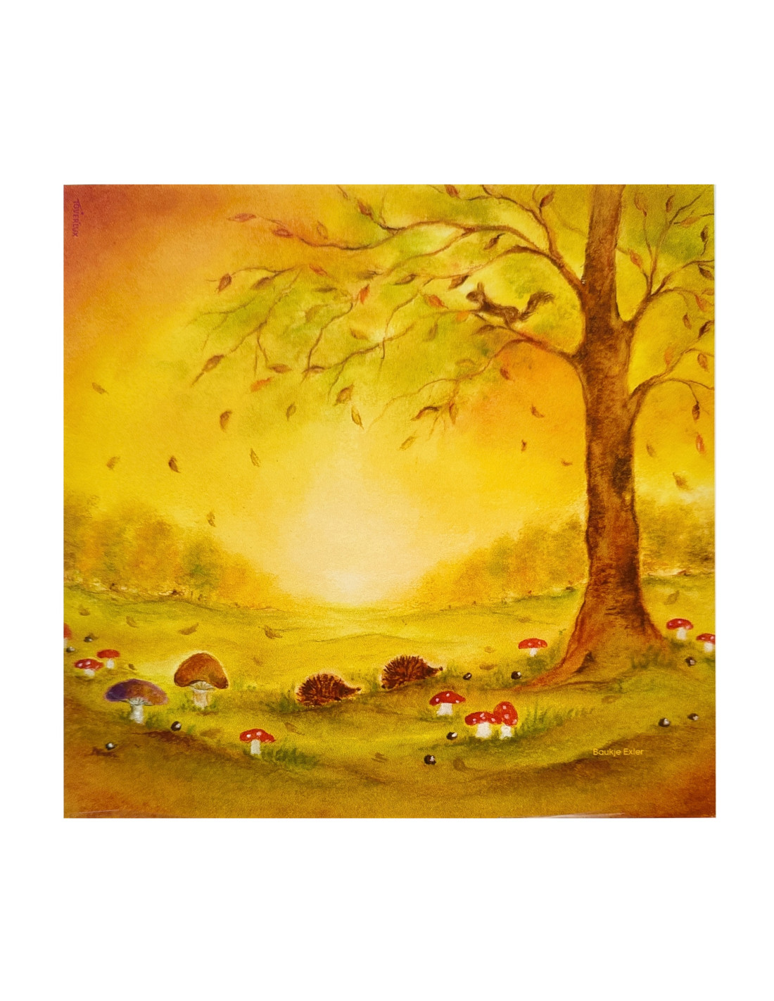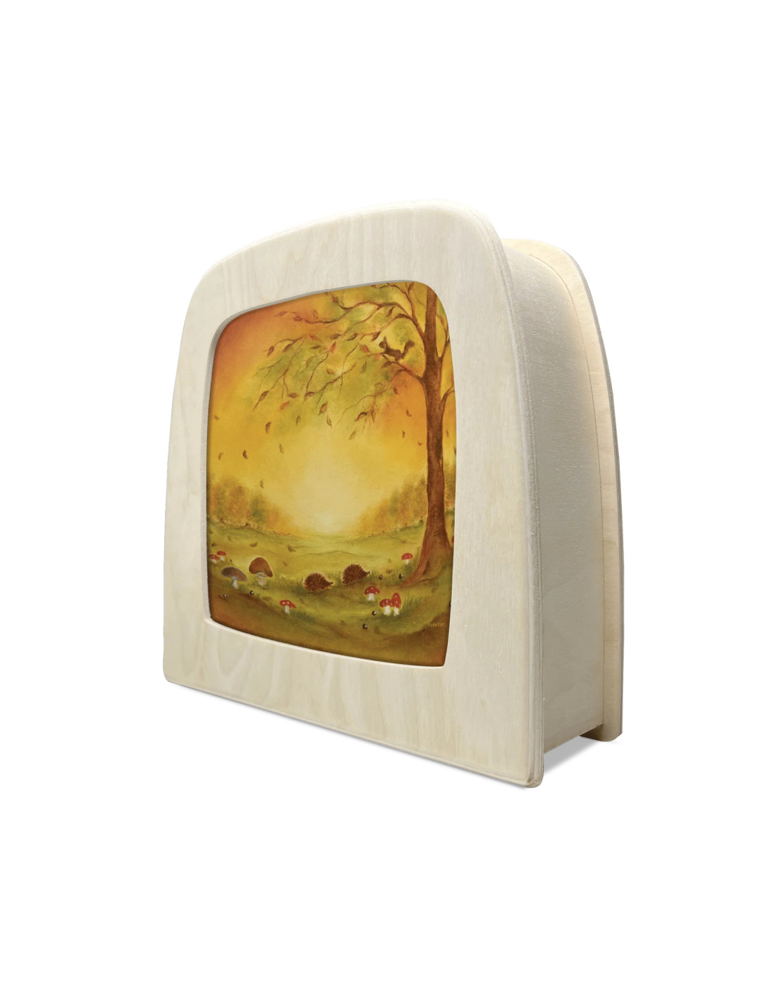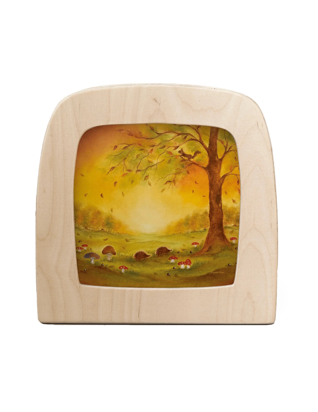 Terwijl de paddestoelen op hun mooist zijn en de blaadjes van de bomen vallen schuifelen de egels over de bos bodem. Met deze plaat breng je in een oogwenk de herfst naar jouw seizoenstafel of kinderkamer. De plaat past precies in de seizoenslamp en is gedrukt op lichtdoorlatende kunststof waardoor de kleuren en structuur van de afbeelding prachtig uitkomen.