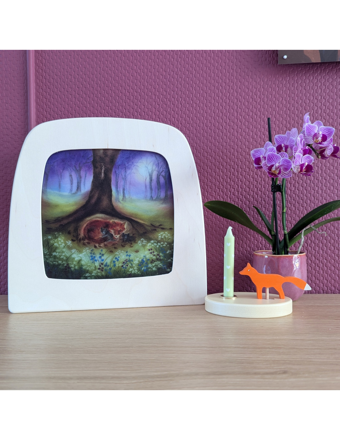 Het is lente en tussen de voorjaarsbloemen ligt een vossen familie in zijn hol onder de boom. Deze wisselplaat voor in de seizoenslamp is geweldig om je (kinder)kamer of seizoenstafel in paas sferen te brengen. Doordat de plaat is gemaakt van lichtdoorlatende kunststof waar de afbeelding op is gedrukt komen de kleuren en structuur van de afbeelding prachtig uit.
