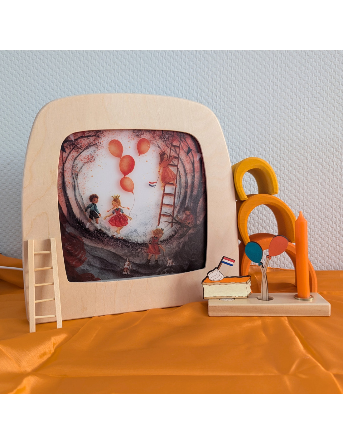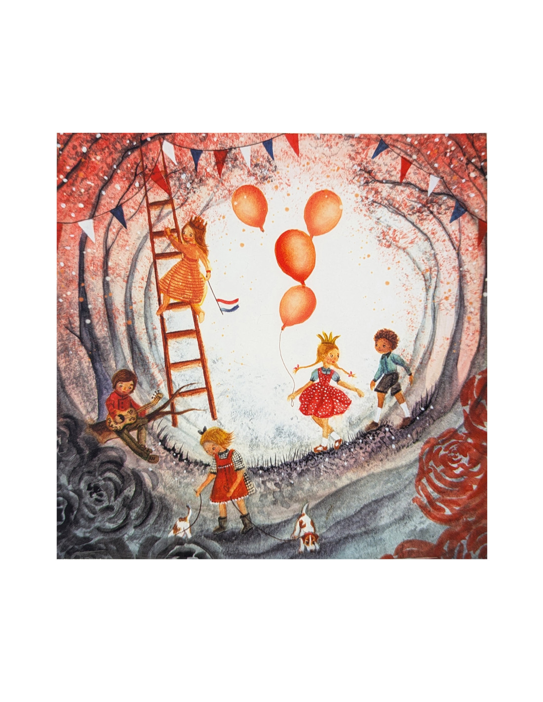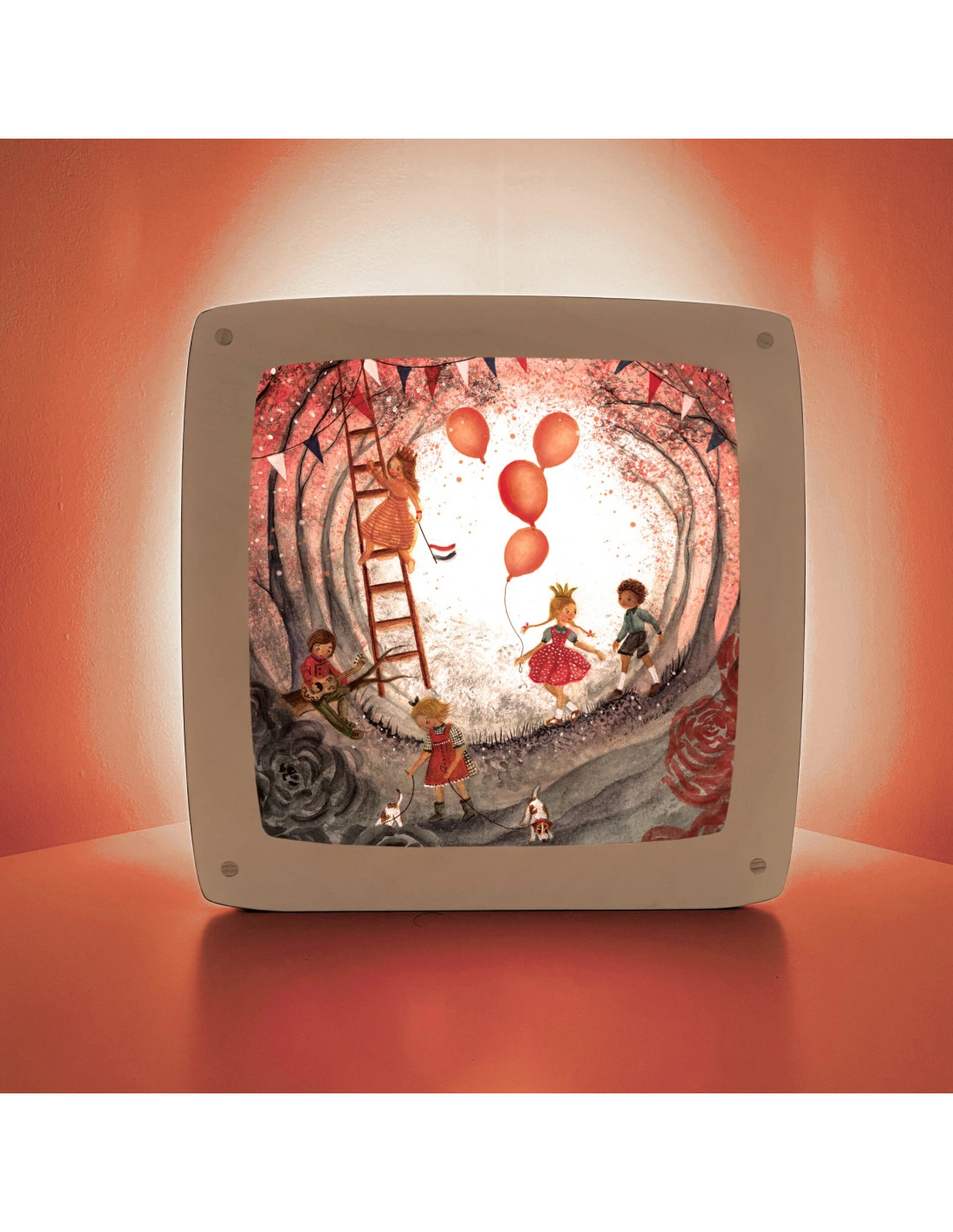 Deze wisselplaat met kinderen die met oranje ballonnen koningsdag vieren is geweldig om eind april op je seizoenstafel te hebben. De plaat past precies in de seizoenslamp of raamhanger en is gemaakt van lichtdoorlatende kunststof waar de afbeelding op is gedrukt waardoor de kleuren en structuur van de afbeelding prachtig uitkomen.