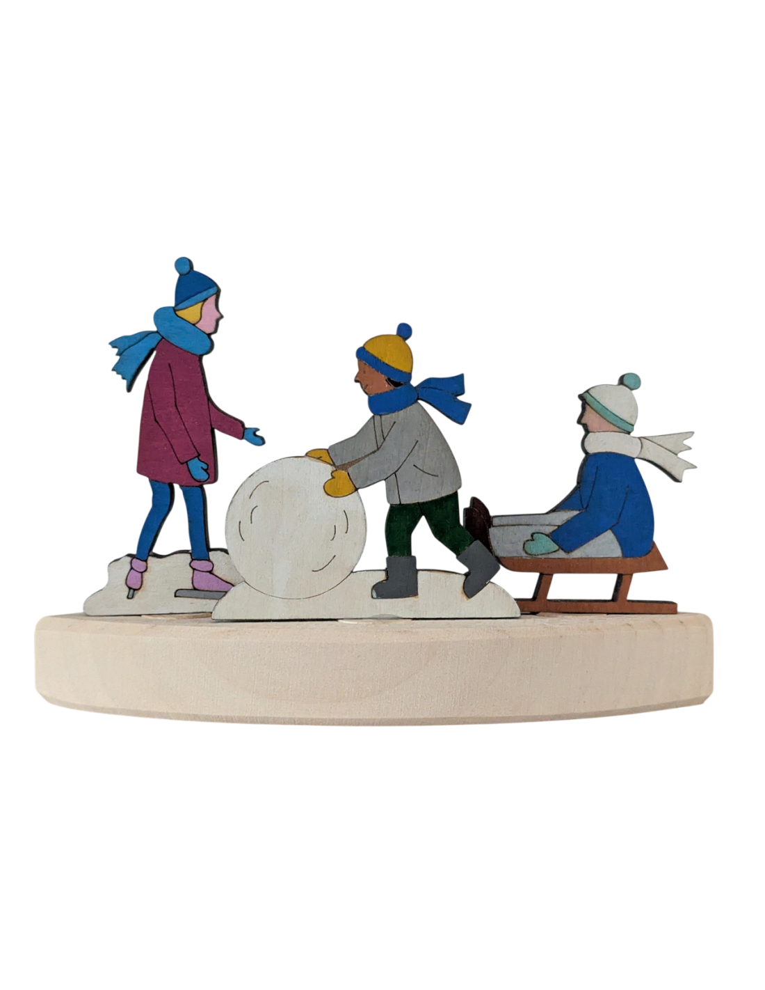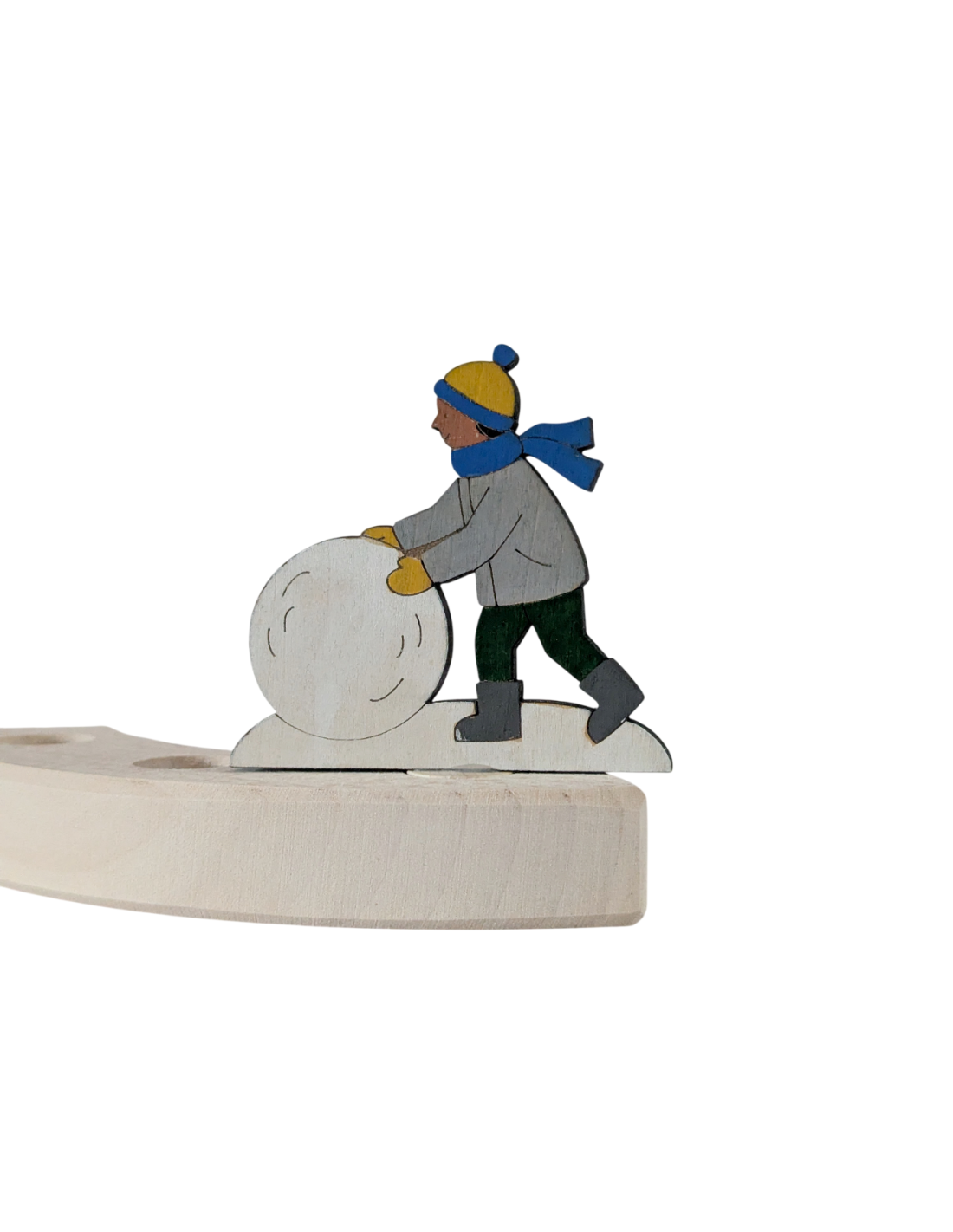Houten steker voor in de verjaardagsring van bv Grimm's met een kindje dat een sneeuwpop maakt van ons eigen Houtspel merk