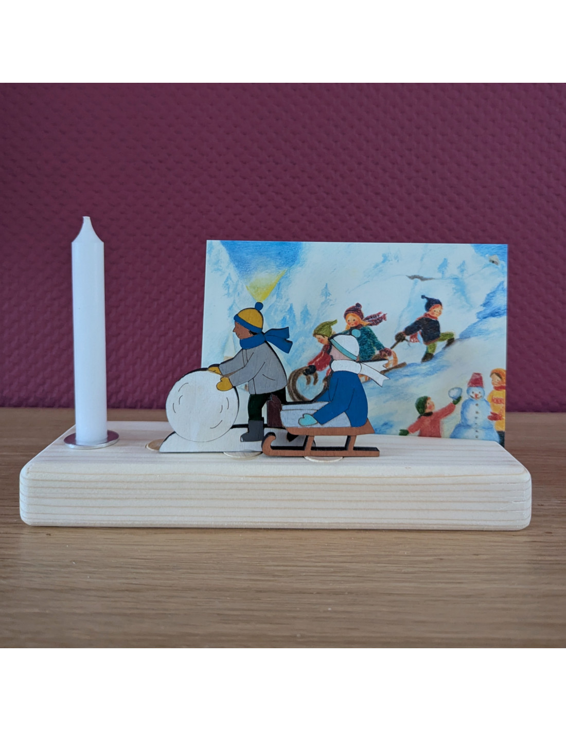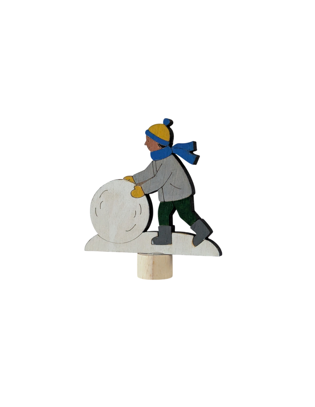 Breng de wintertafel of verjaardagsring tot leven met deze leuke steker van een kindje welke een sneeuwpop aan het maken is. De steker past precies in de verjaardagsring, bijvoorbeeld van Grimm's of van ons eigen merk en heeft een vrolijk gekleurde voorkant met onder andere een donkergroene broek en een grijze jas en een neutraal houten achterkant.